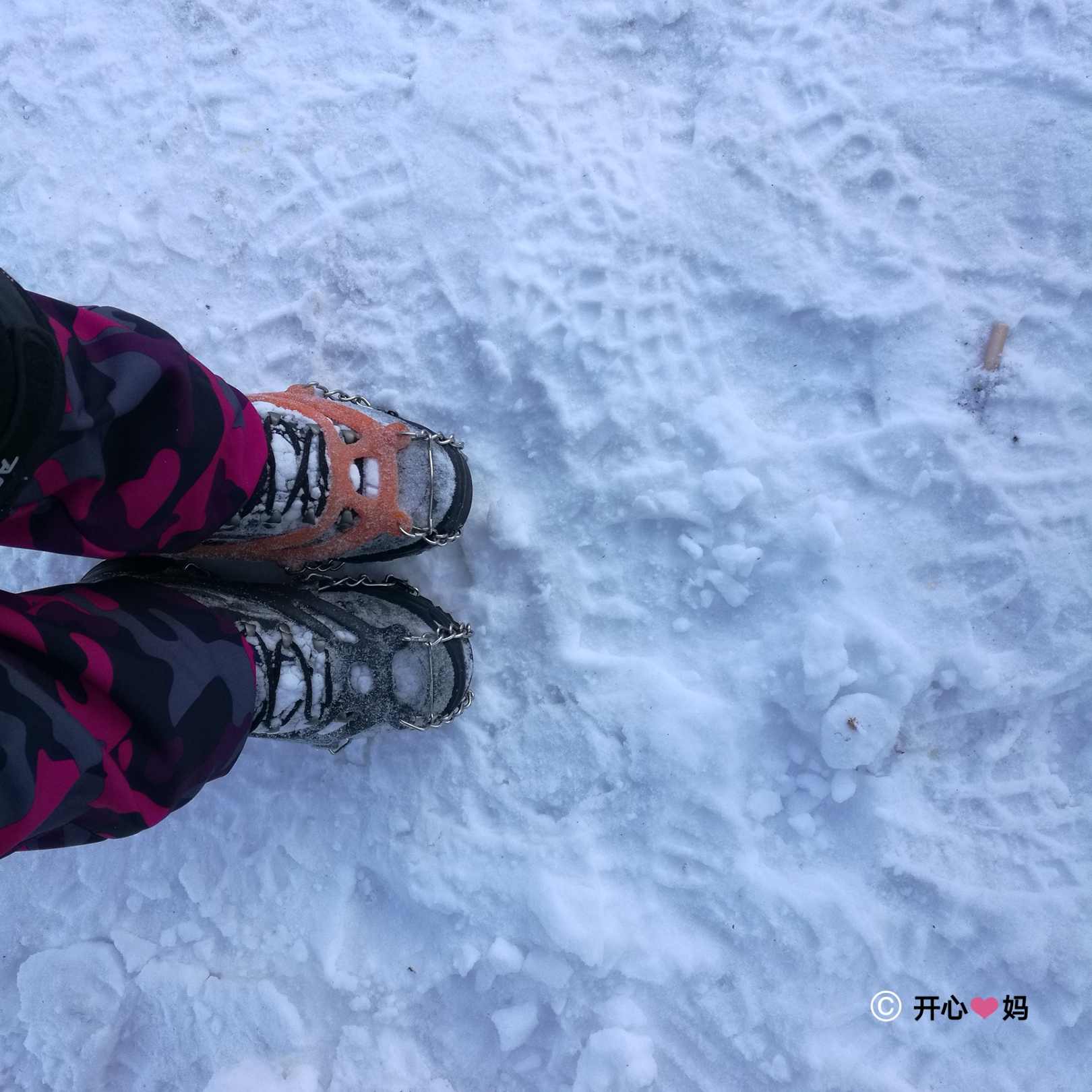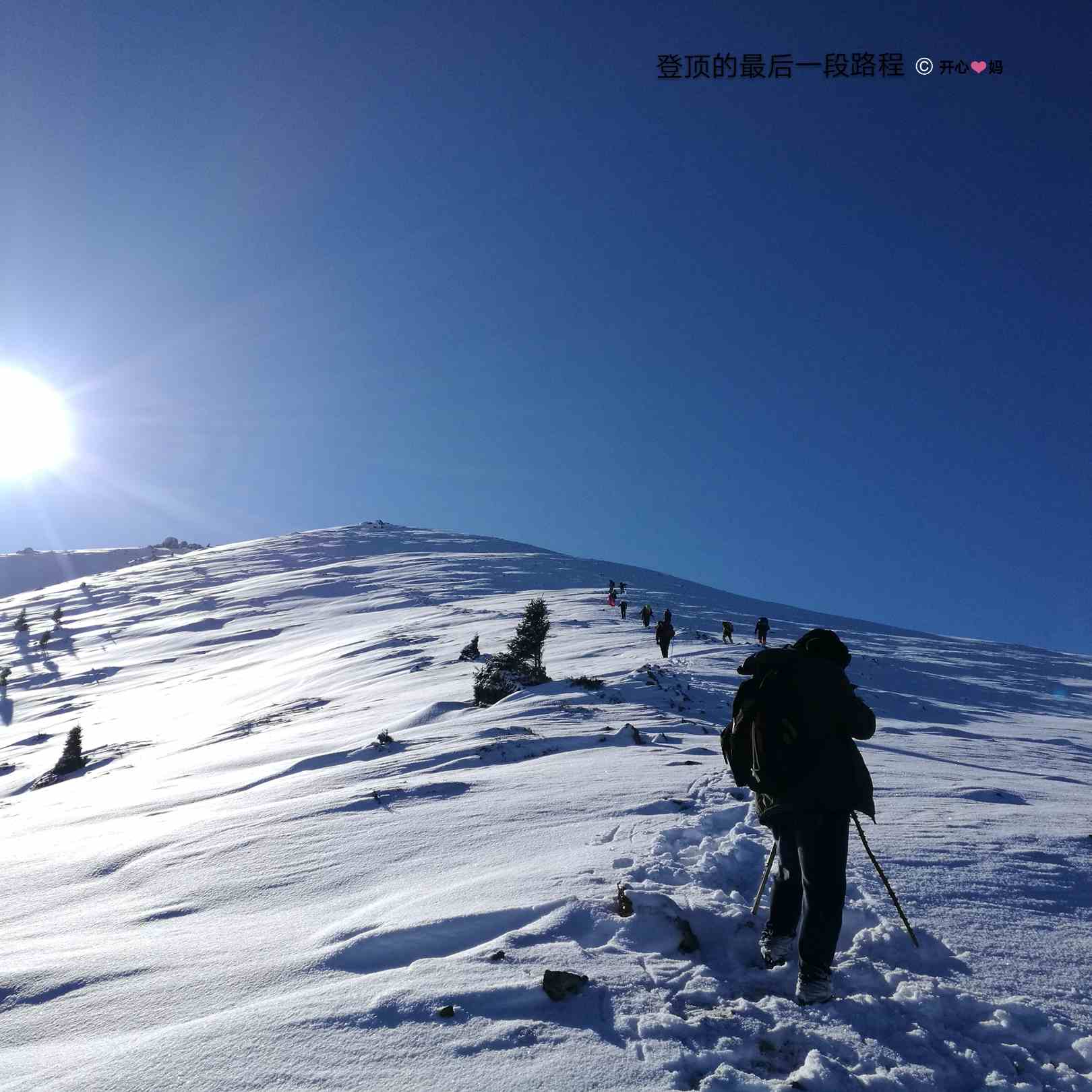 这是我第一次冬季户外徒步,刚开始我还信心百倍的往前走,走了一半,我就觉得我快走不动了,而且我觉得我离他们很远的距离,总觉得拖团队后腿的感觉,无数次我都想放弃了,但沉默的梦每走一段都会很有耐心的在前面等着我,告诉我“没事,慢慢走”,五星宏和沉默的梦,每人匀出一只冰爪给我穿上(左脚沉默的梦的冰爪,右脚五星宏的冰爪),而他们都各自只穿了一只冰爪去登顶,登山路上的艰险路滑,只有登过的人才知道。在我想放弃时候,我就会告诉自己我们是一个整体,我不能拖团队的后腿,不能因为我一个人影响整个团队,坚持,就要到山顶了。在我实在走不动时候就会转头看看后面,后面还有人,继续前行。最终我用蜗牛的速度,勇往直前一步一步的挪上了山顶,但比第一队友晚了快五十分钟,比第八名队友晚了十几分钟。
