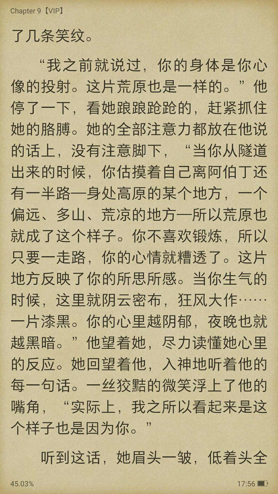 #摆渡人# 你的身体是你心像的投影,这片荒原也是。跟张德芬全套书主题有异曲同工之妙 :亲爱的,外面没有别人,只有你自己!荒原是内心的映射,我很赞同,作者笔下的那些荒原随着迪伦心境改变而变。如果命运是一条孤独的河流,谁会是你灵魂的摆渡人?崔思坦是迪伦走过荒原的摆渡人,迪伦更是崔思坦走向解脱的摆渡人,刚开始把崔思坦当做救命稻草,什么都依靠他,后来没有他,必须一个人面对,勇敢的越过一山又一山,克服一个又一个困难,摆渡人或许是领路人,但真正带领我们穿越荒原的其实是我们自己。似乎是这样,我们如何看待这个世界,这个世界就是怎样的,自己决定了自己的世界。