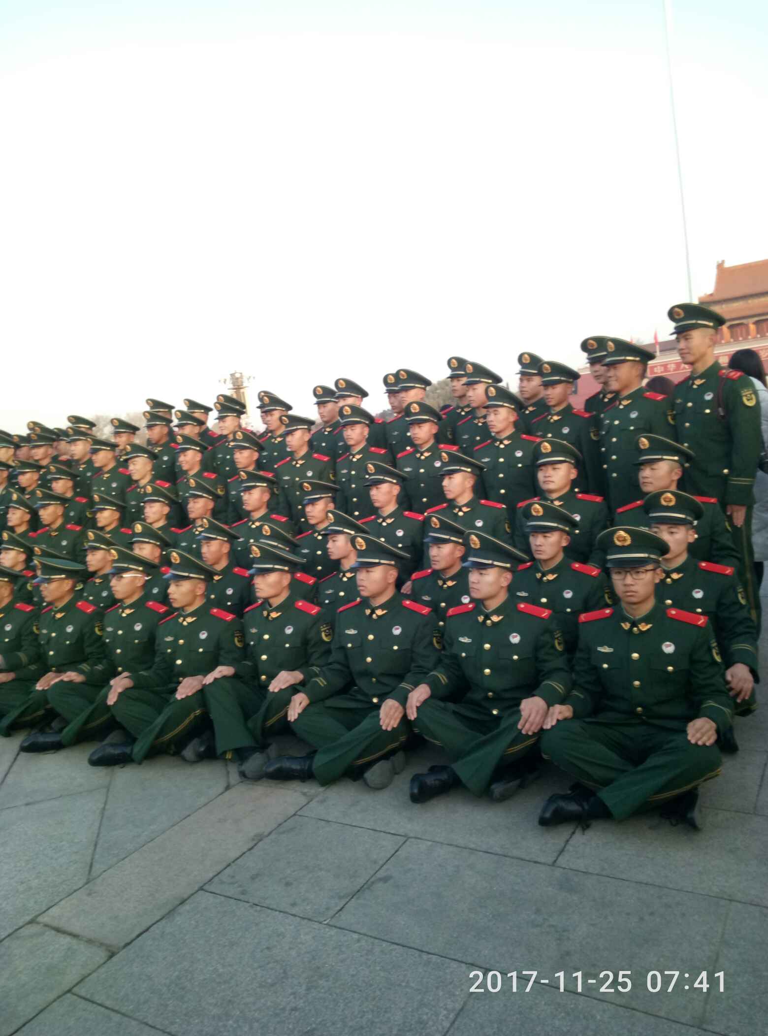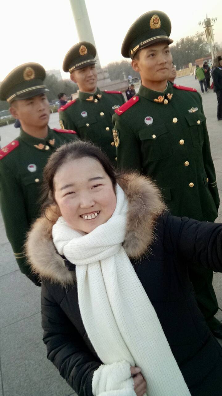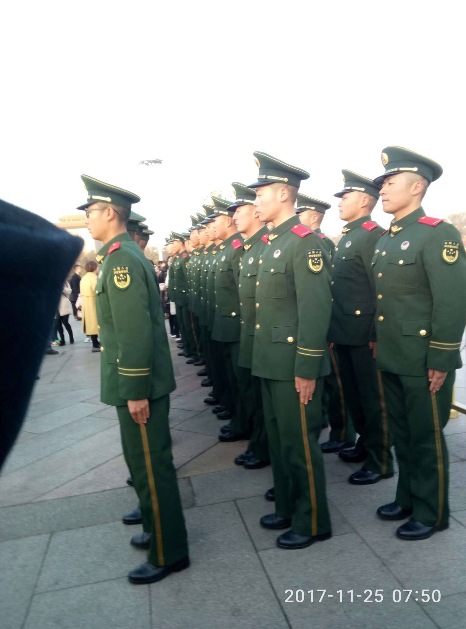 而且还把自拍杆忘记带了,又花10块钱买了一个,网上看今天升旗的时间是7:10,听到国歌响起才知道已经开始了,赶忙开始录像,无奈手机像素不行,拍的不清楚。不过今天遇到好多好多的兵哥哥们,哦,不,应该是兵弟弟们了!都排着队来天安门广场上照相,这可激动坏了那些女游客们,当然我也很激动,