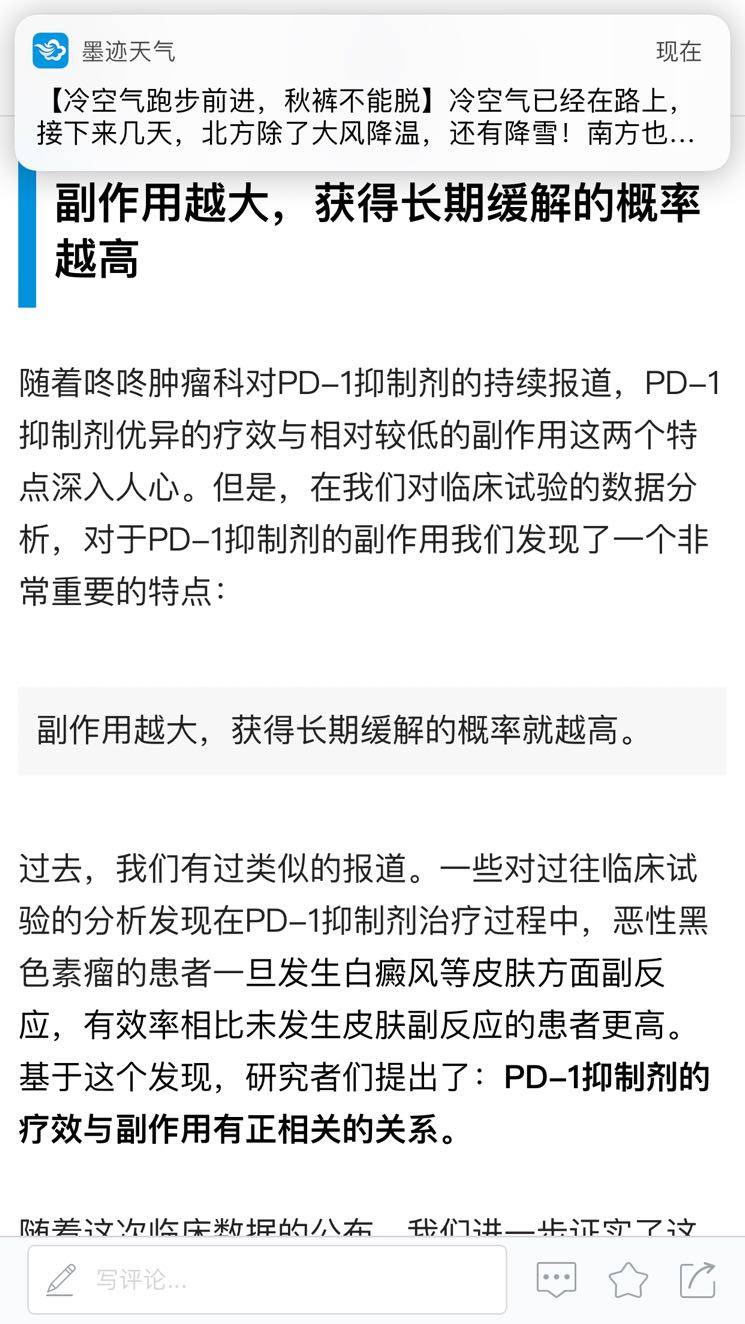关于pd1的使用频率和期限。各种文献资料越来越多的谈到。pd1一旦起效可能会长期有效。这个论断在我家也得到印证,Snoopy家更是长期印证。这其中有个大家都非常关注的问题。用了pd1多长时间几针起效。这个应该因人而已。常规讲四针起效通过CT血液等检测观察。而我家是一针后便起效。7月份第一针约十天后至今停了止疼药,咳嗽痰都少了。CT显示停了两个月后肿瘤还一直在缩小。