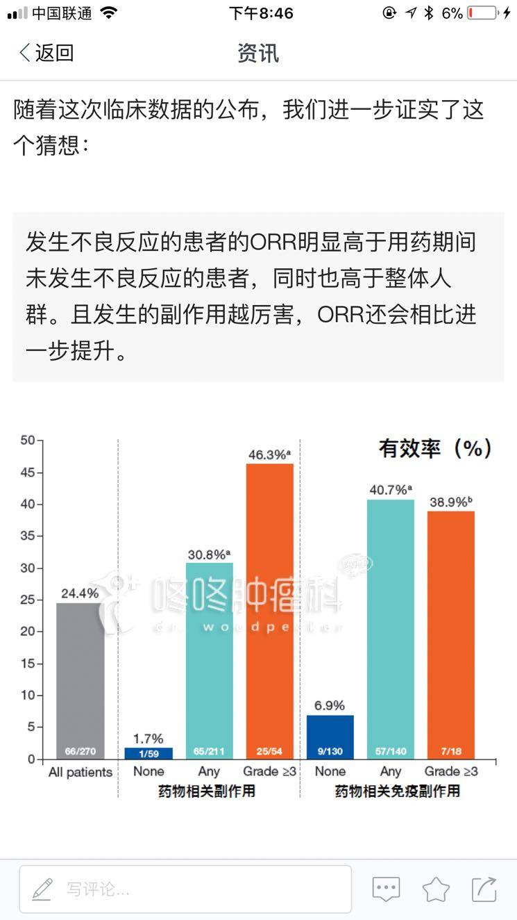最后总结。对于大多数人,pd1的正道是沧桑。pd1有效率大约在20%。当通过检测可以使用pd1时,请适当提前机会使用,现在又有许多联药的方案,让Pd1有效率成倍增长。使用后请多些严谨、多些细致的观察。关于副作用,应当是比化疗要小的,身体基础好副作用会小很多,出现了副作用一定不要慌,要科学用药。最后希望战友们,多些幸运,都能成功,一起努力!