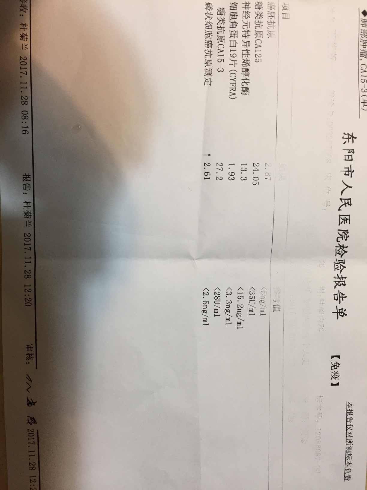 拿到化验结果真的是太高兴了!上个月偏高的两个指标这个月都正常了,就是磷状细胞癌抗原偏高一点点,医生说不用当心,真好!老爸自我感觉也很好,去无锡姑妈家玩了一个月,心情很好!希望老爸能一直这么好下去!停了一个月的中药,今天又开始中药调理了!