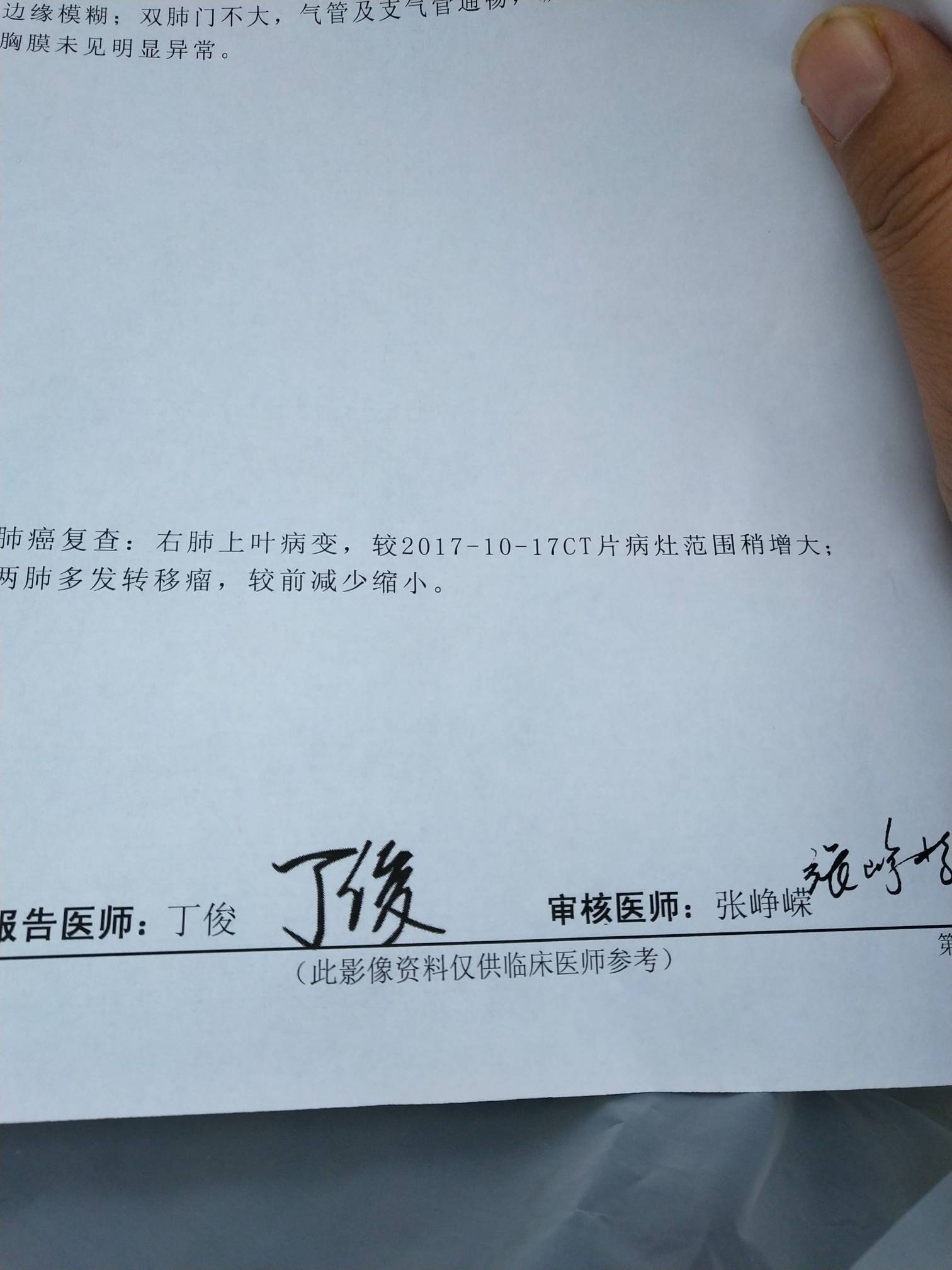 你拍的不够完整,看不到影像是怎么描述的,按字义是右肺上叶病变稍有进展,病灶变大了点,但有可能是两次拍CT角度有所变动,会造成一定误差。从两肺多发转移瘤较前减少缩小来看,也许是9291有效了,不要太过担心,但还要咨询医生意见并密切观察。