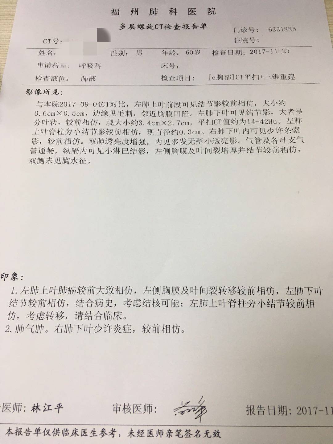 这次复查,原发病灶0.6cmx0.5cm;左肺下叶结核与肿瘤混合体大小3.4cmx2.7cm;左肺上叶脊柱旁小结节直径0.3cm;以上三项影像所见均与9月4日CT相仿,病情保持平稳。