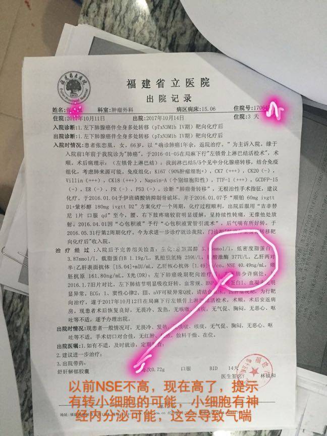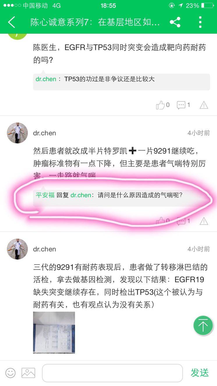 陈波医生陈医生给了一下的建议:1,9291➕2992服用加强克服耐药(9291三代后再耐药,且之前就有TP53,考虑可能随着TP53丰度增高导致耐),复查CT排查间质性肺炎,针对阻塞性通气功能障碍,予以雾化缓解气道痉挛阻塞,可以排查肺拴赛了解是否跟气喘有关 2 如果如此靶向控制不住,可以换9291➕1775 3如果再控制不住,且小细胞肺癌的指标NSE继续增高,用化疗来打击(小细胞肺癌对化疗敏感)
