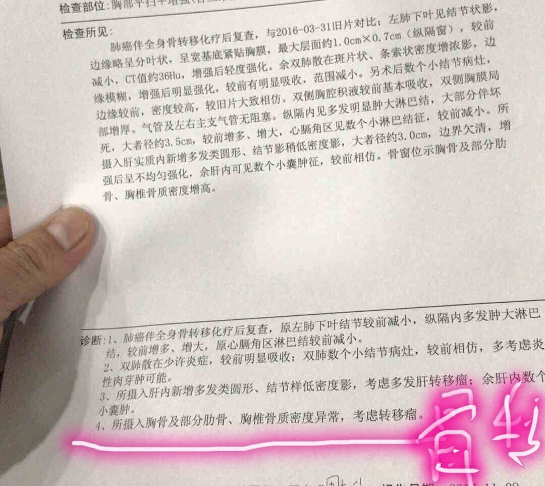 陈波医生见到了实际的胶片后,陈医生明确了,肺内的肿瘤确实跟原来差不多,虽然有新发骨转移,肿瘤标志物增高