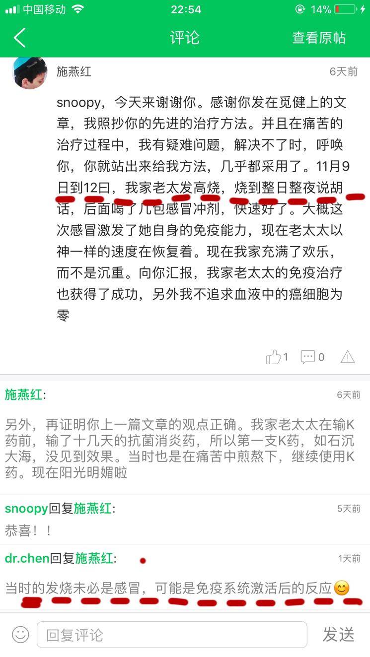 陈医生的观点认为,用完PD1能够出现发烧,说明免疫系统还能有反应啊!没有被肿瘤打垮。那些做了恩次化疗,肿瘤不断进展,全身很虚弱才开始用PD1的,估计免疫系统即便能够重新识别肿瘤,也很难战胜它了。