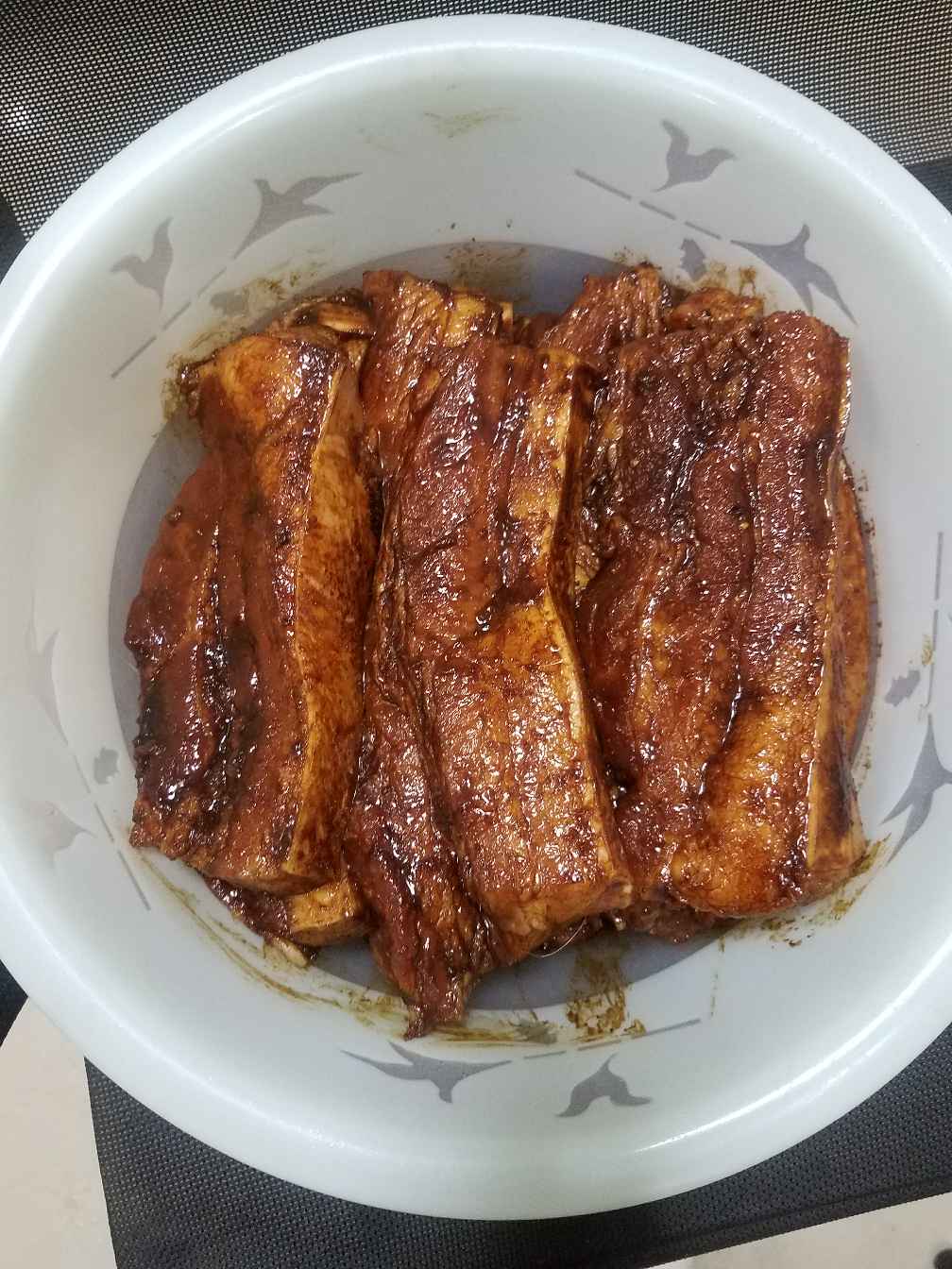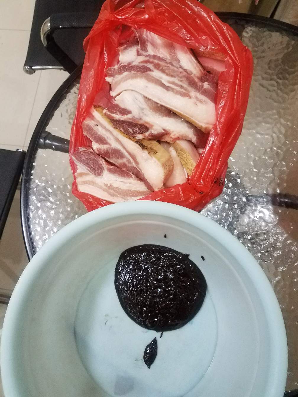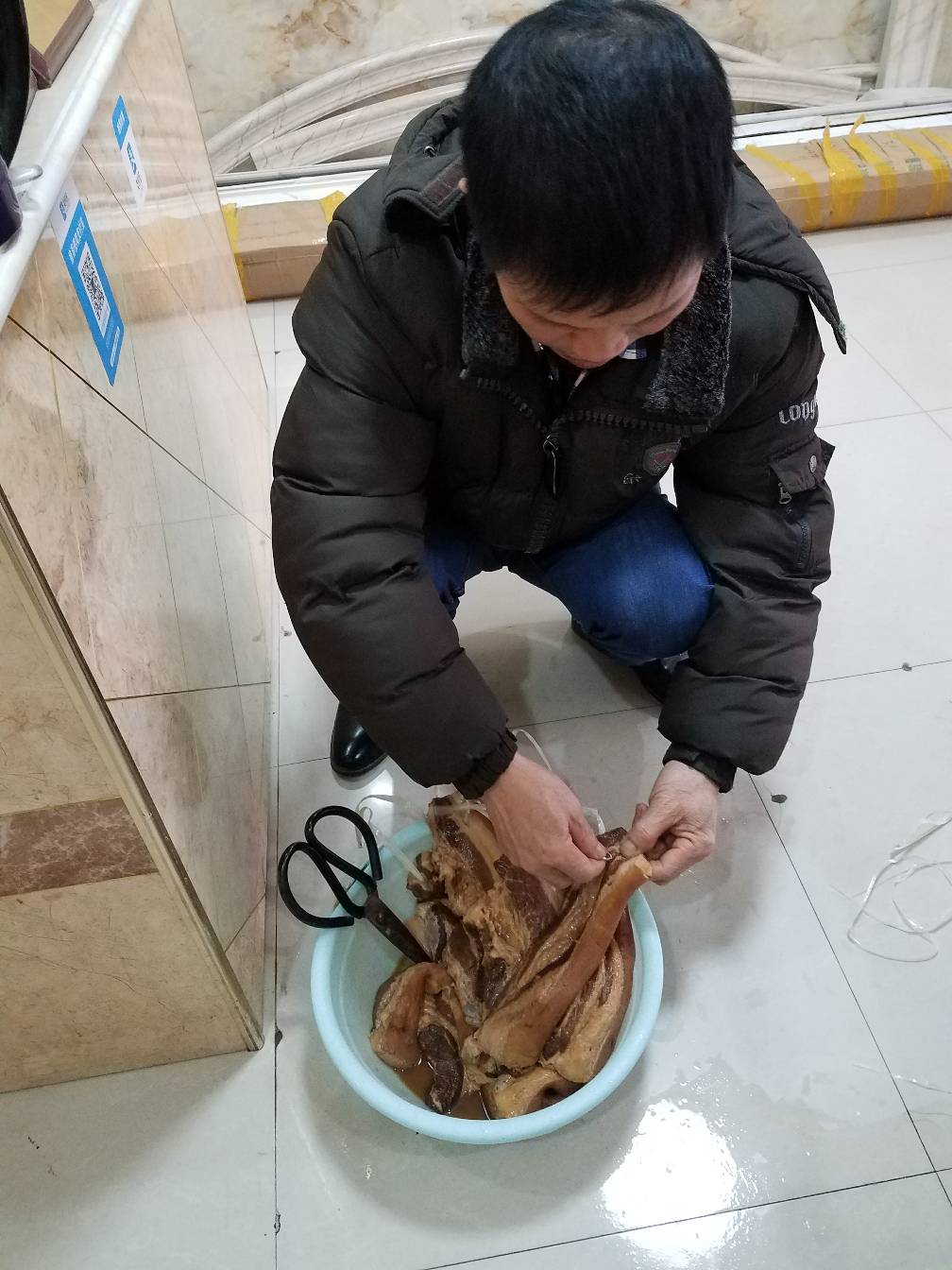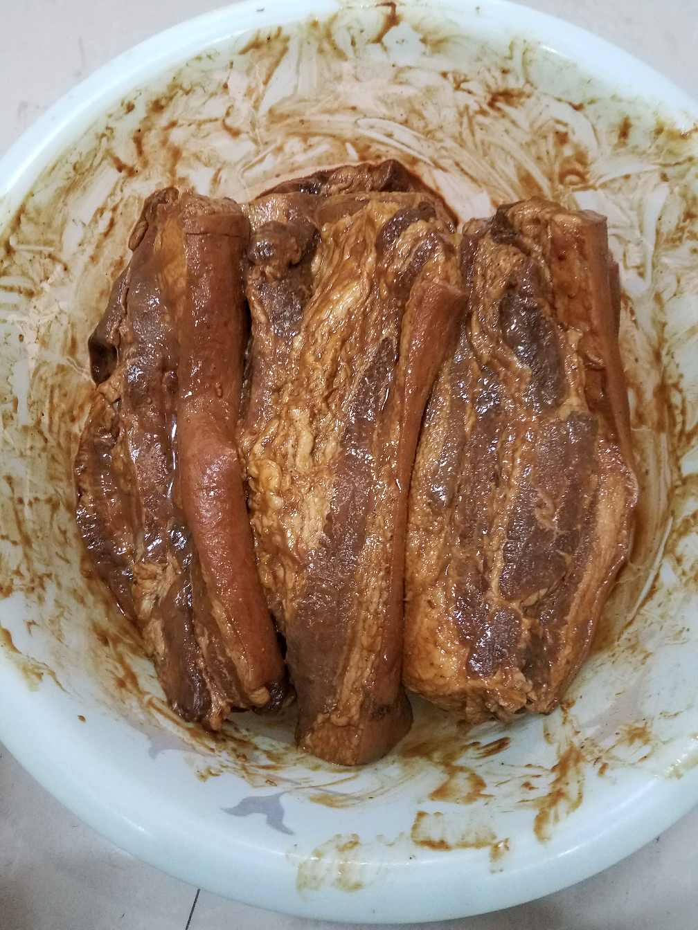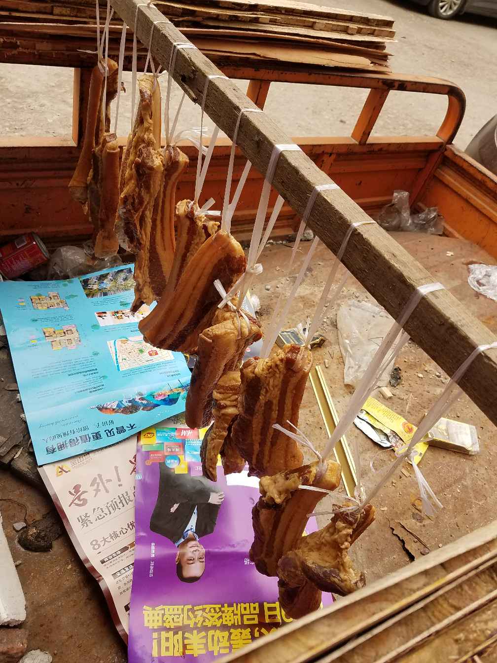 然后就听那位病友教我做,让我买的时候让人家帮切成一块块,买回来了就涂上酱料,每天都翻一下肉,腌上6一7天,然后再用温热水洗干净,再凉到通风的地方去,等一个月就可以吃了!