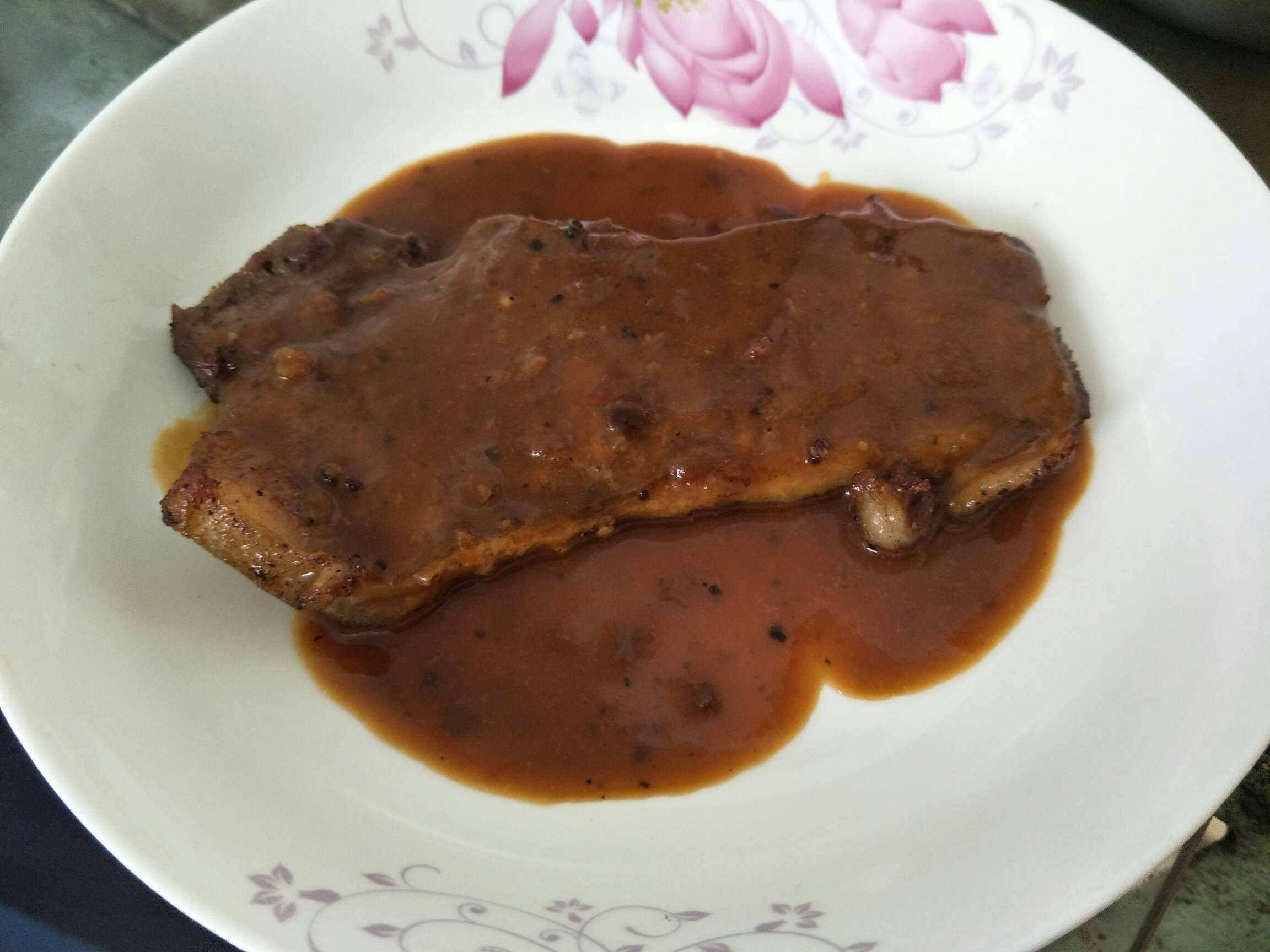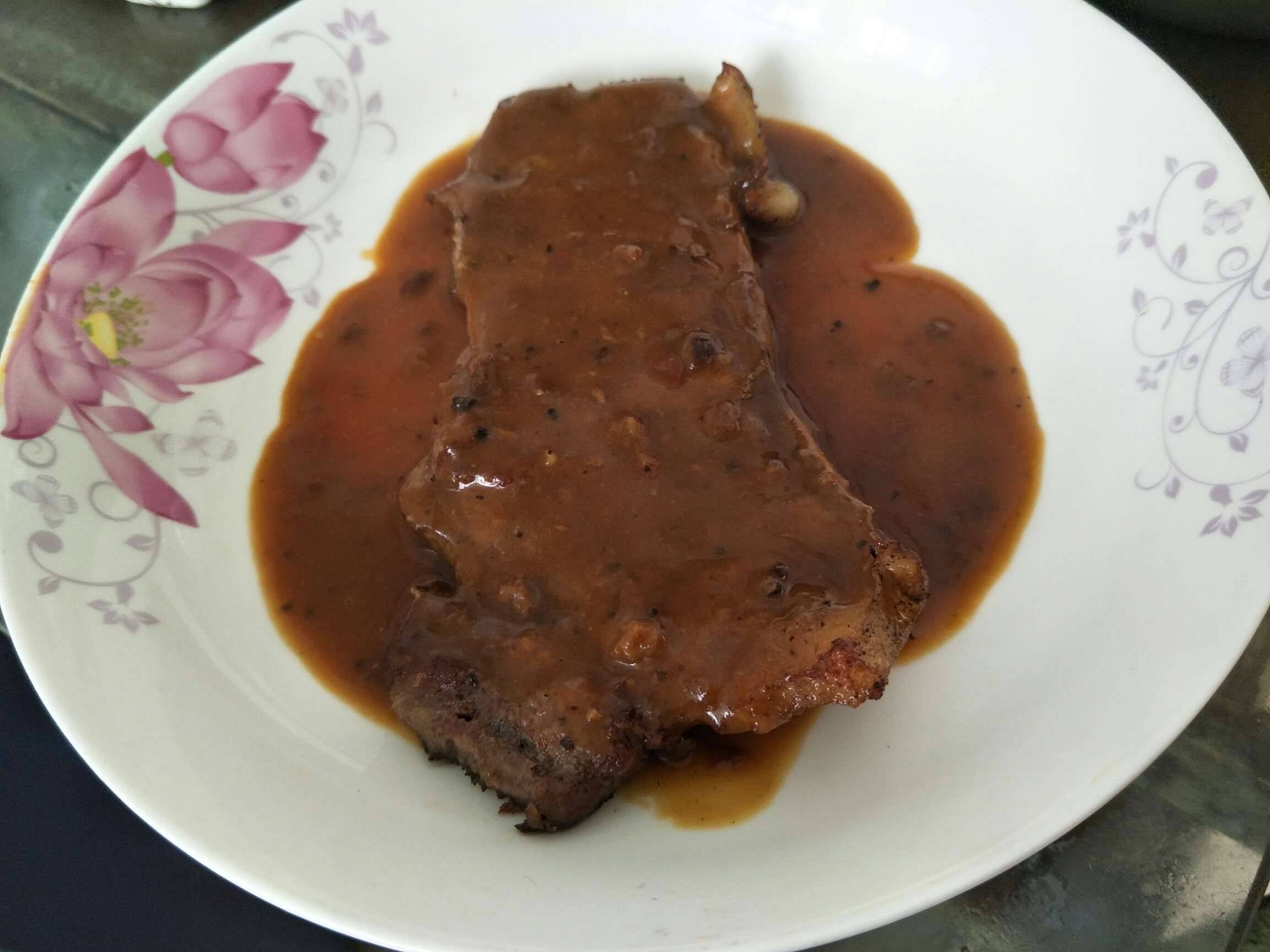 中午,我就大显身手,给妈妈做这份牛排,我发现,貌似不太真实,没有什么骚味😂我以前对这些牛味,就是比较反感吧!但我这次是没有反感,还行的,虽然只是随便的加工,不过也讲技巧的哦,哈哈😅😅中小火煎熟,然后歇凉了,再翻,上碟,再把黑椒汁加热,上面,有菜花加个菜花装饰下就ok啦,完美!好赞,妈妈吃完了,不剩,谢谢😘😚😗😙