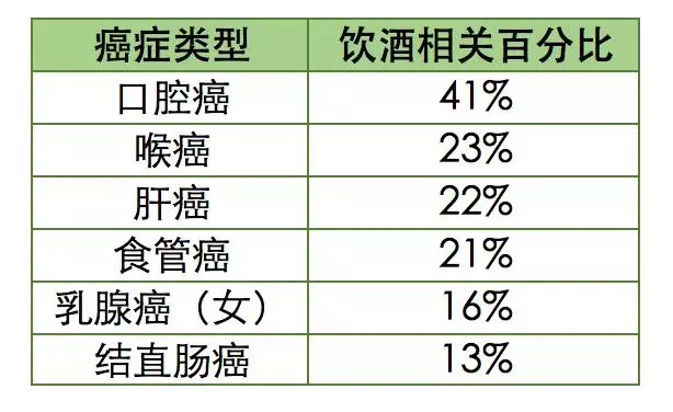 饮酒和常见的乳腺癌,结直肠癌,肝癌,食管癌,胃癌和胰腺癌等都有直接关系。当然,和酒精关系最密切的癌症类型,来自喝酒会直接接触的组织:口腔癌,喉癌,食管癌等。来自美国的最新数据显示,41%口腔癌,21%食管癌都和饮酒有关。