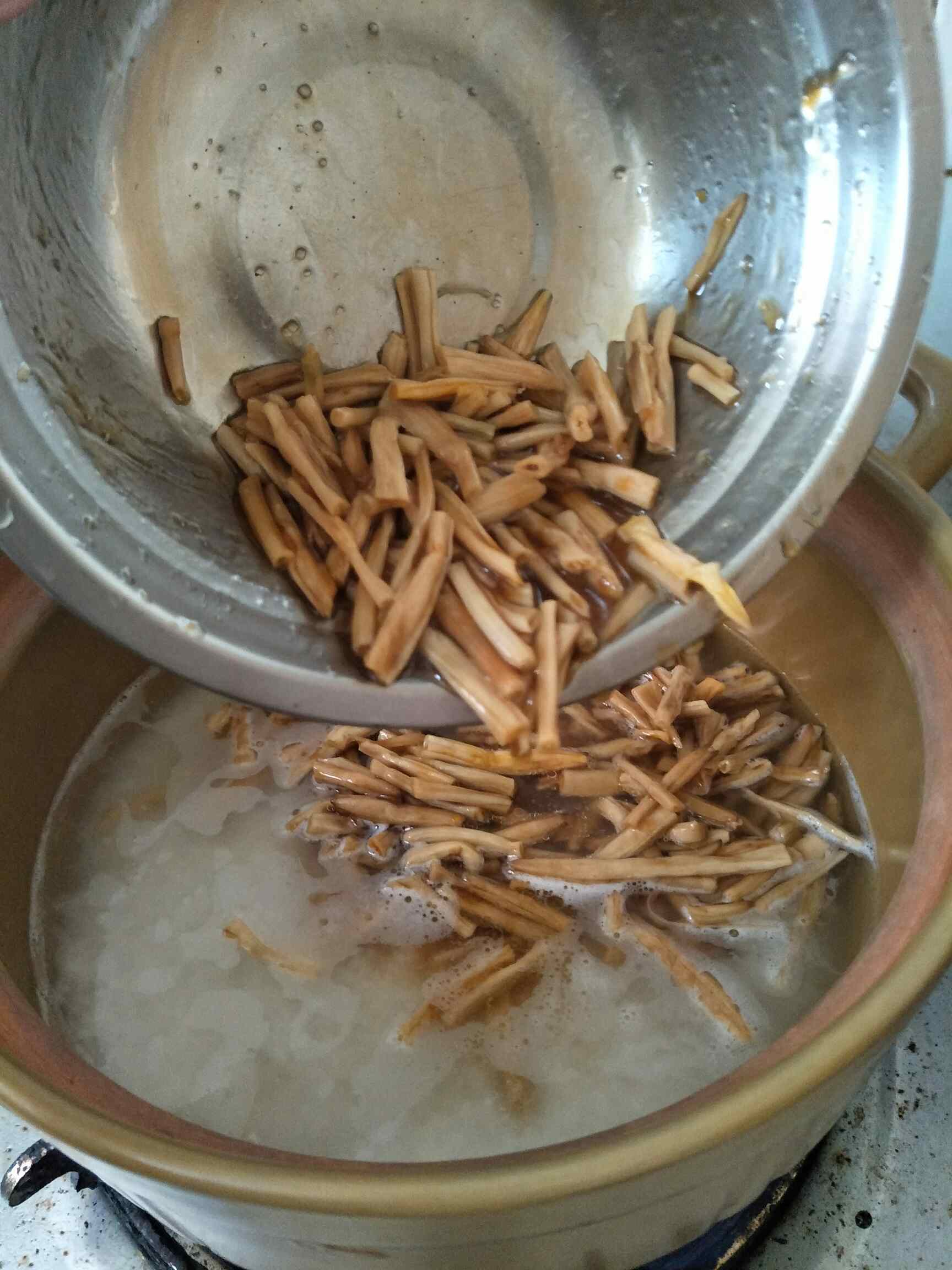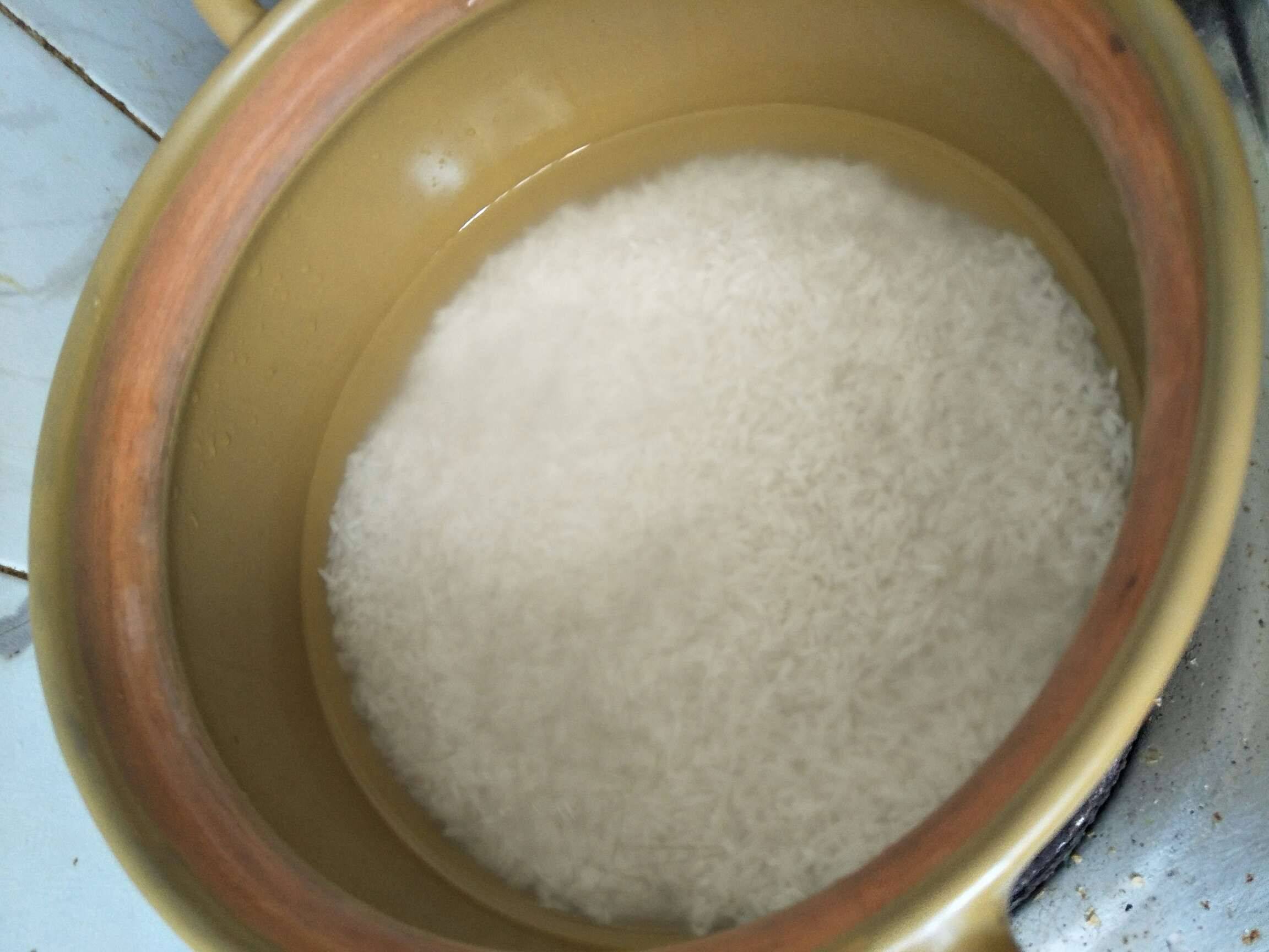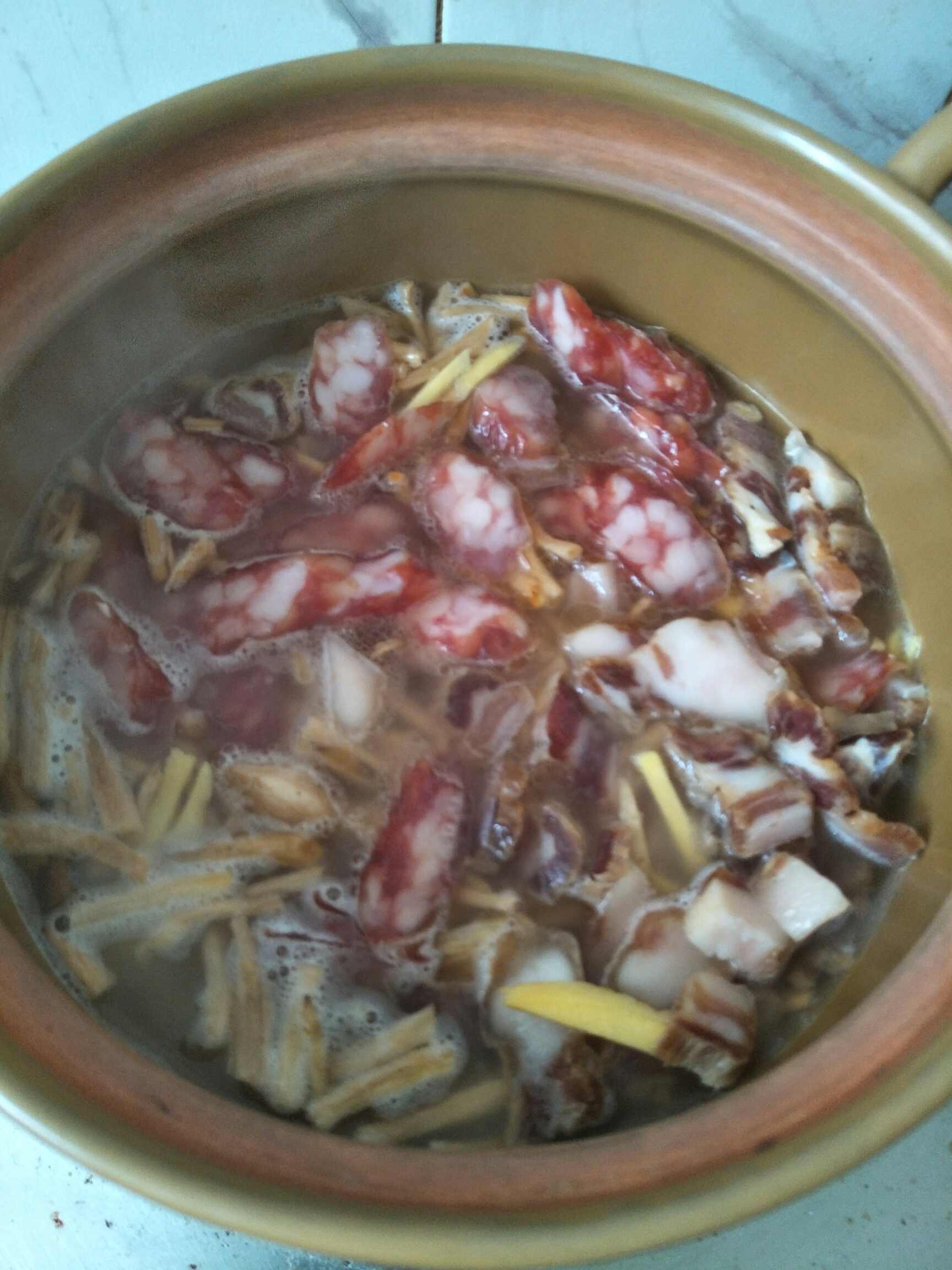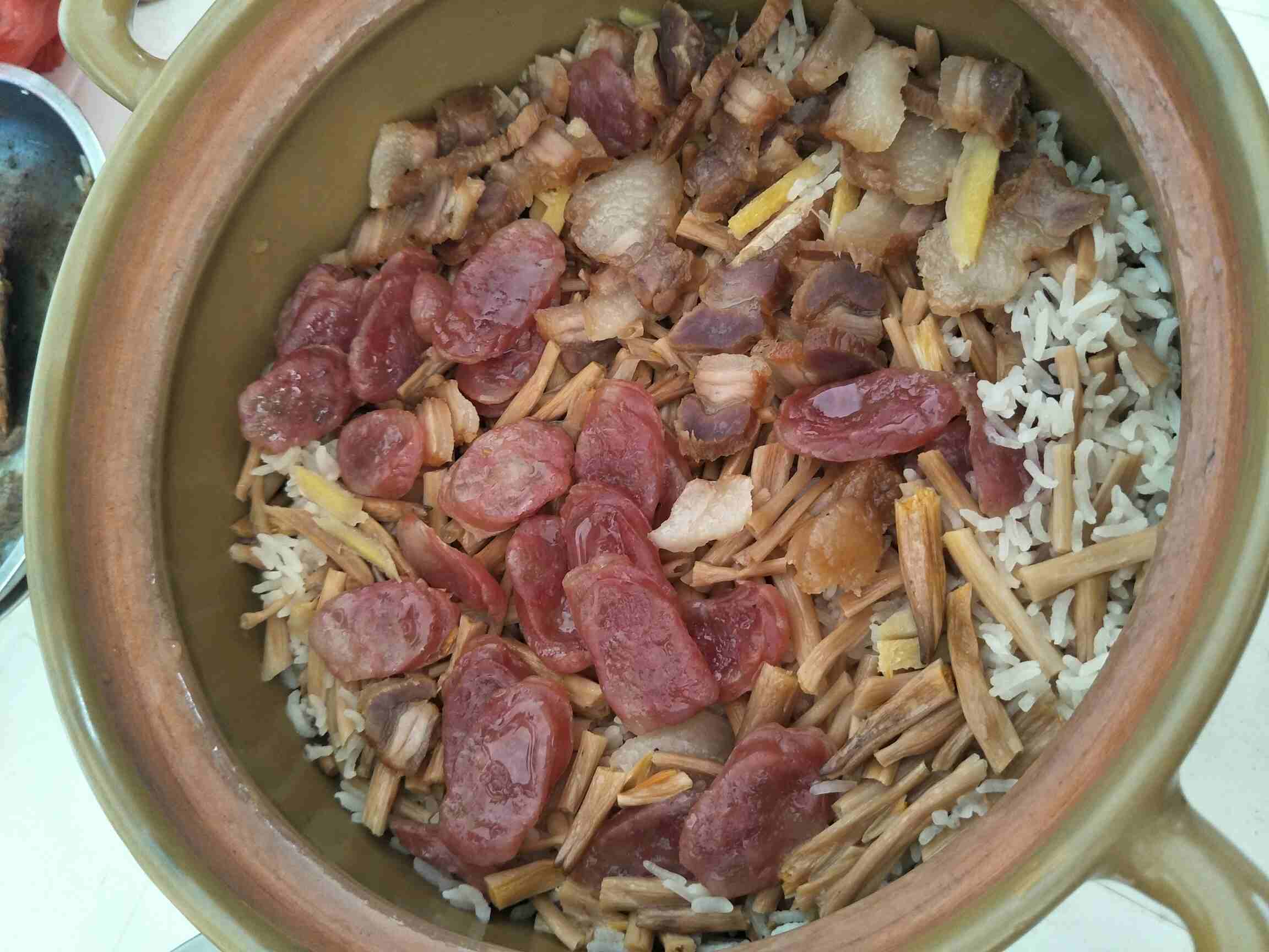 6.米放入瓦锅里,放入适量的水,开始煮,差不多开了,放入黄花菜,再放入腊肠,腊肉,撒姜丝,盖盖子,即可