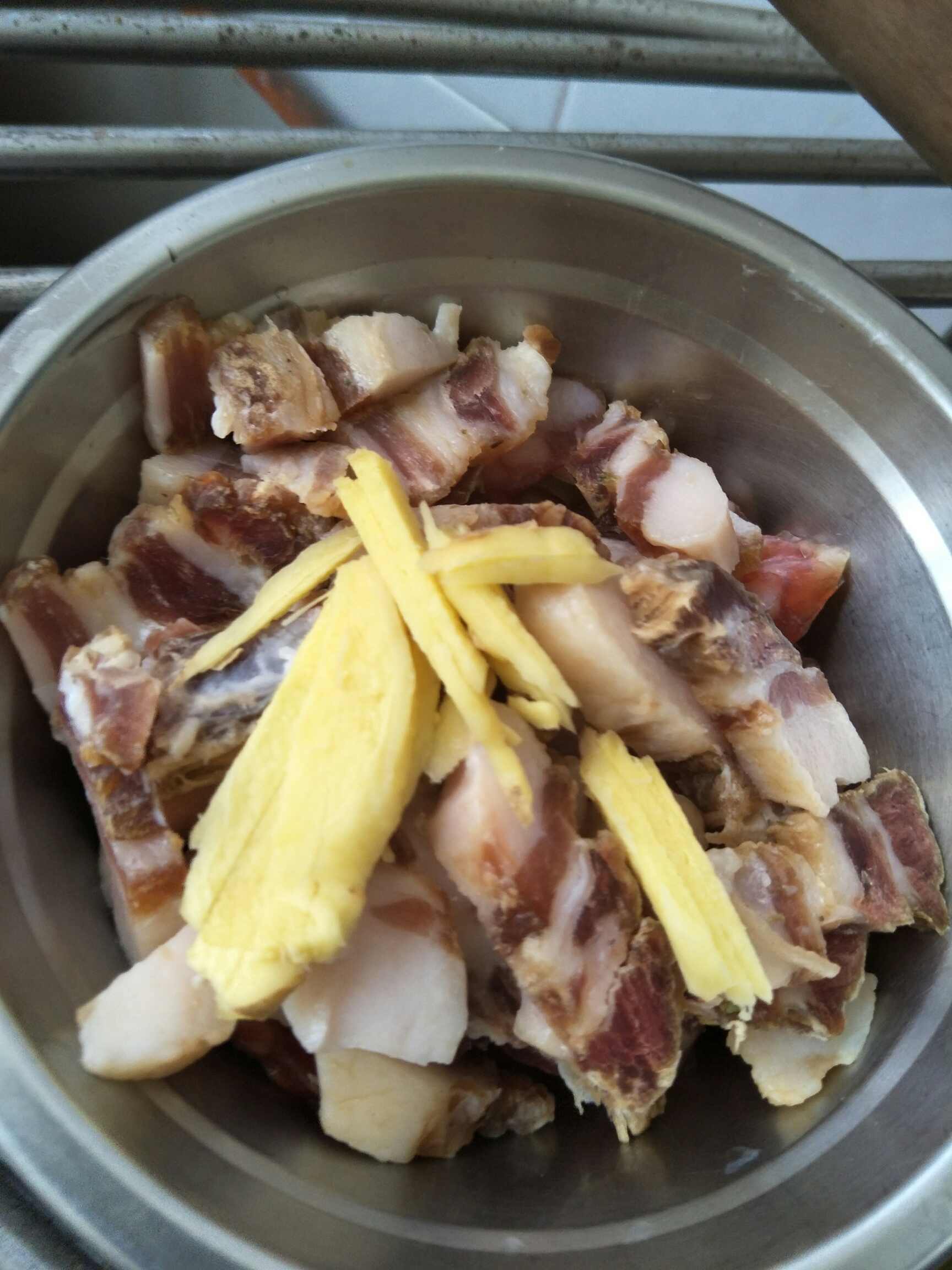 2.腊肠,腊肉切好,用开水烫一遍,备用