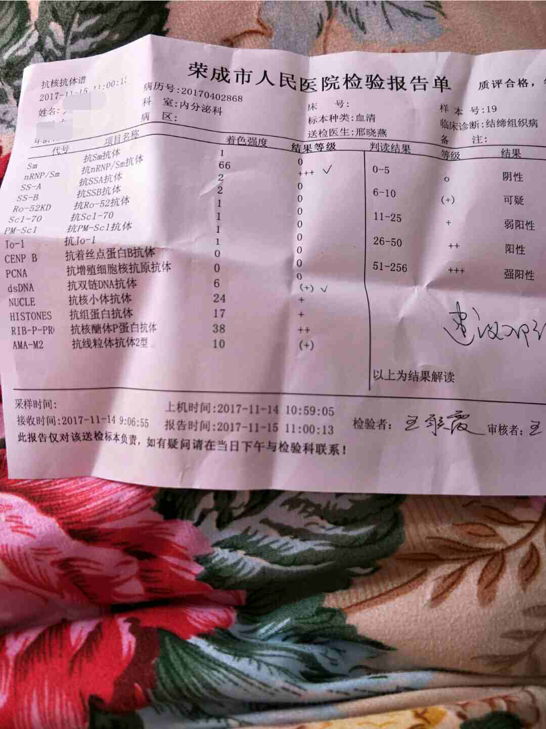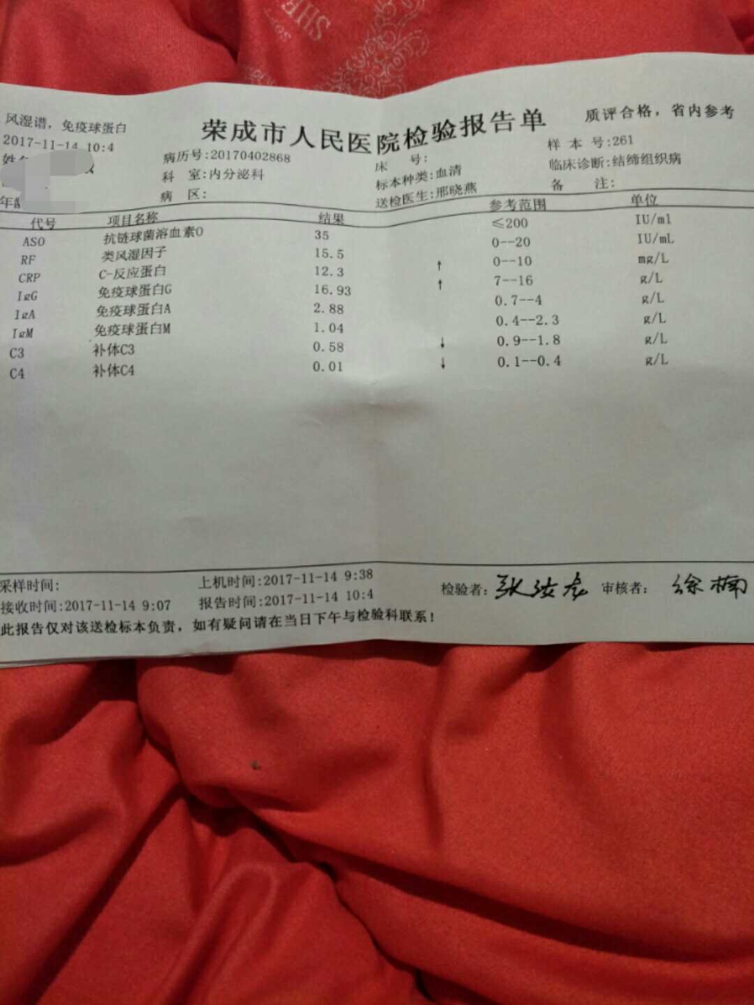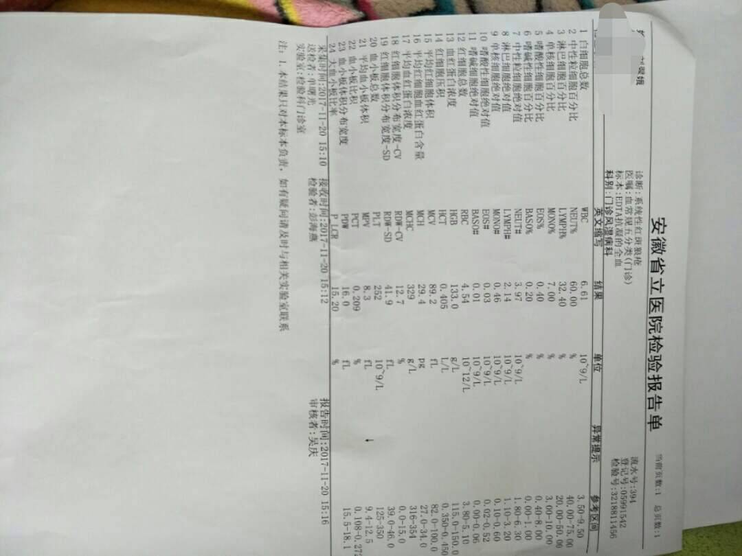 一个月前复查的,医生说有点复发。也没住院,五年来第一次复发,一直半片激素,医生让我加到五片,五片吃了一个月,我感觉有一些好转。天我吃了四片,这几天脸右侧里面大牙处有一些疼不知道是不是口腔溃疡。估计是红,有点红肿,不知道是不是我吃橘子太多的原因。还是跟这个病有关系,因为这几天我吃四片激素,不是又严重了吧,希望只是简单的上火,因为我自己私自减去了一片激素。下面这些是一个月前的检查单,准备过了元旦再去复查。希望大家给一些意见,谢谢。