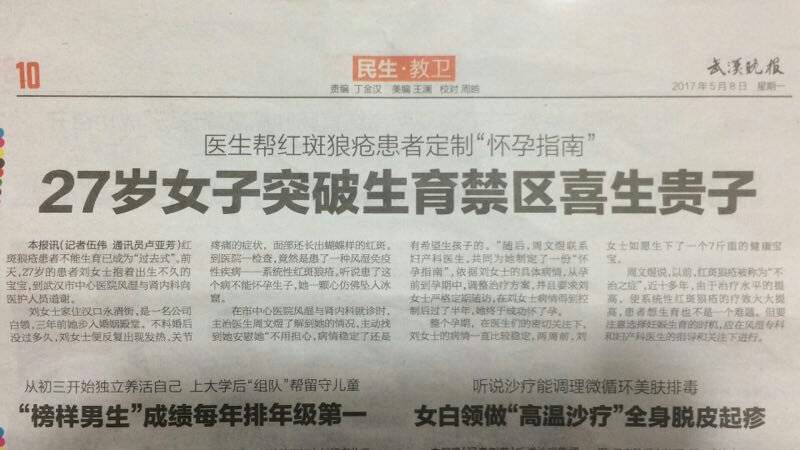 周医生帮助红斑狼疮病人成功怀孕诞下健康宝宝,登了武汉晚报,蛮早之前我二叔看到拍下照片发我的,一直保存在手机里