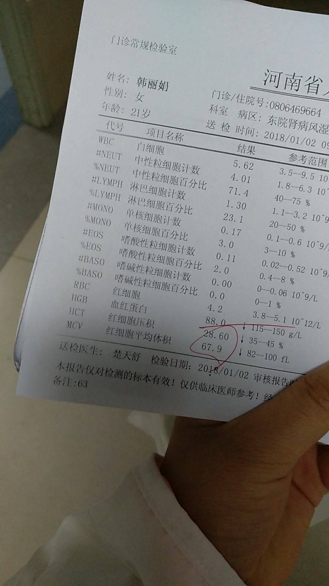 红细胞正常啊,你那两个有剪头的指标不重要吧?
