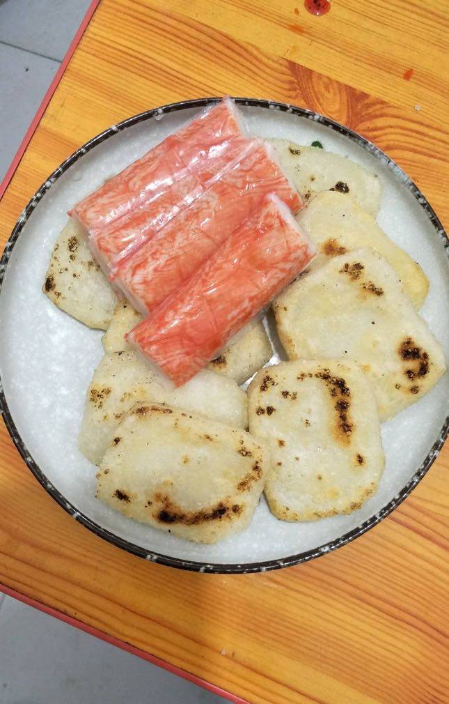 饿了他一小时,快三点,给他烤了盘年糕,怕吃了没味道,又拆了包蟹棒给他配上。。