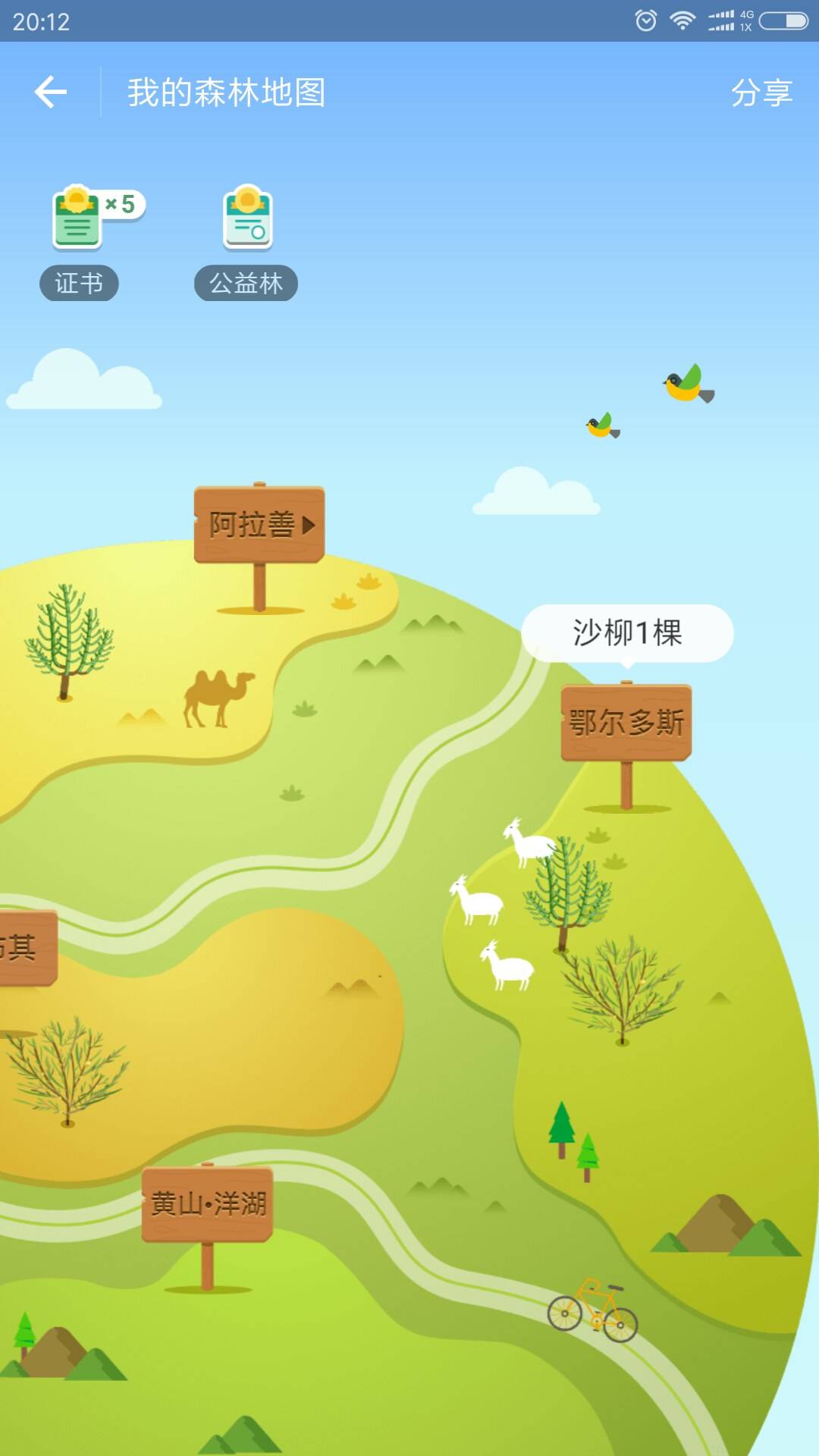 3:争取在支付宝〈蚂蚁森林〉里多种几颗树,最好能在库布其种上“樟子松和胡杨”,完成有生之年的沙漠行,能亲手摸摸它们。为此,我要多走步,积攒能量。