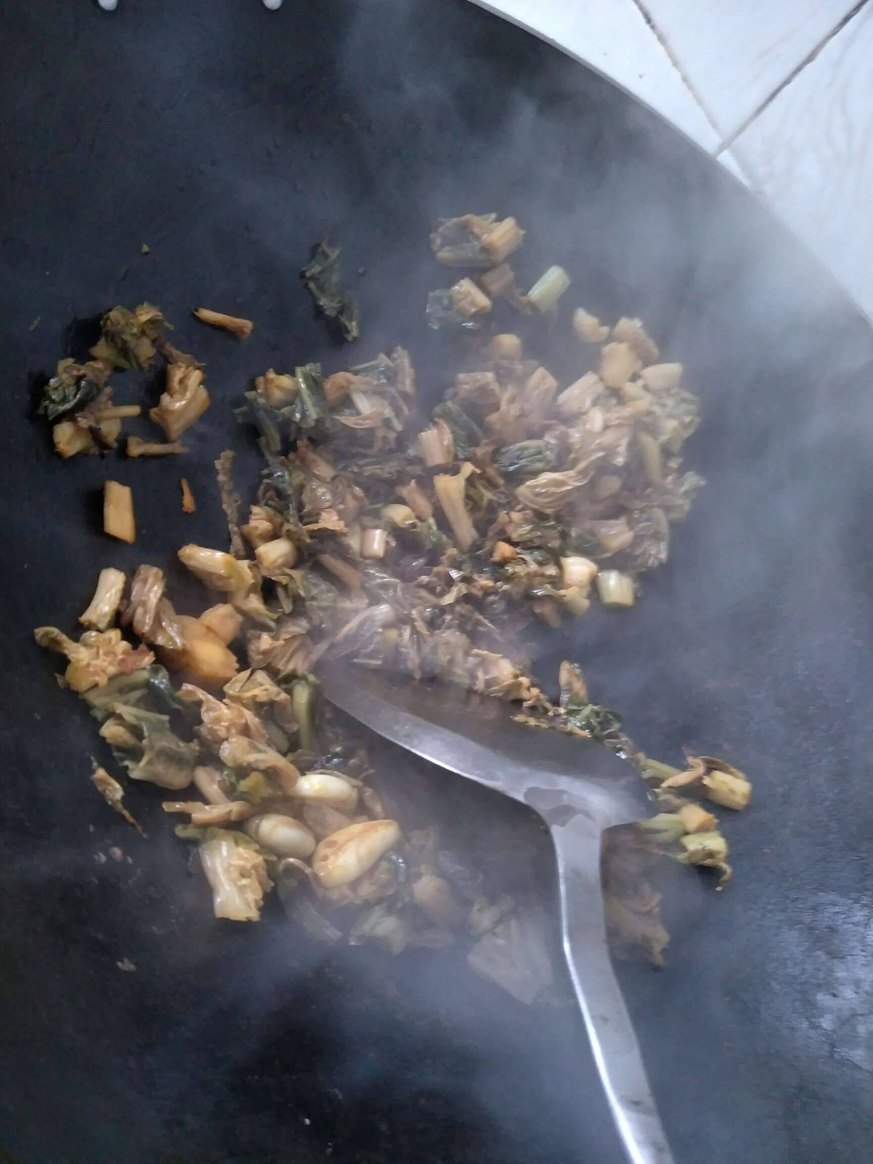 烧红锅,放油,把蒜头放入烧红的锅里,加入八角,把蒜头爆香,放入梅菜,炒至香味出来!放入黄酒,闻到香味即可收火了!