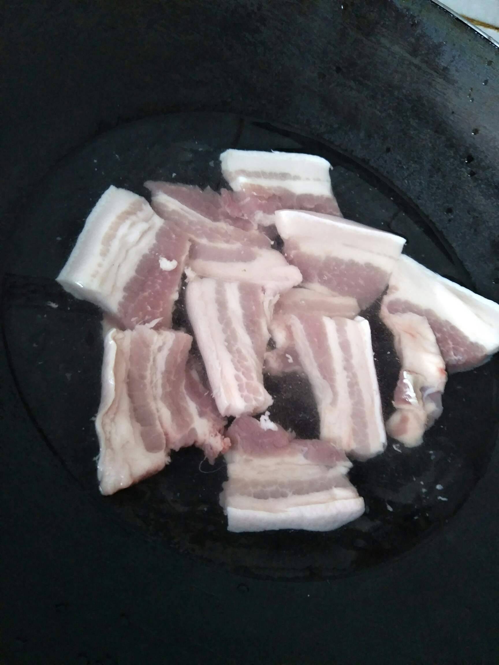 把锅烧红,放油,放入砂糖,煮融化了之后,放入煮过的五花肉上色(本来用的炸的,可我感觉会上火,不这样了!可以用我说的方式代替)