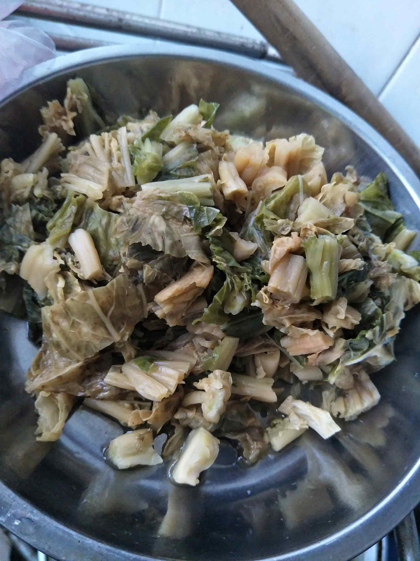 梅菜切好,洗干净,过一遍热水,煮一煮!