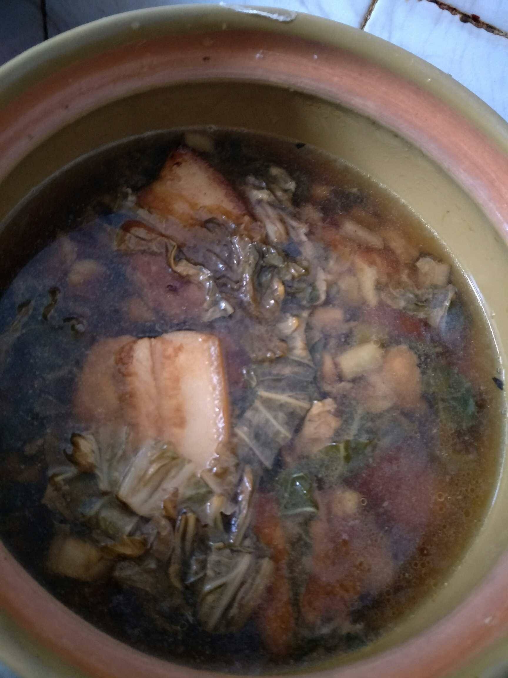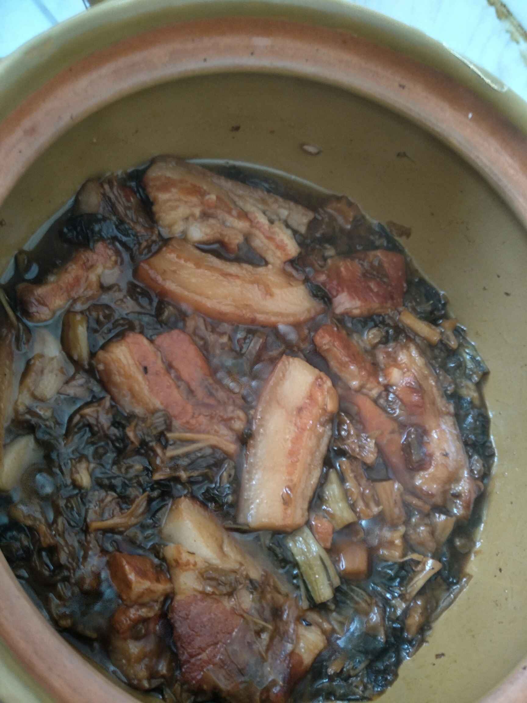 煮开了以后,火力调小,细火慢炖,慢慢的,整个屋里都是梅菜的味道😄😄,我炖了一个多小时吧,就把五花肉炖化了差不多,熄火了,注意‼‼瓦锅是熄火后,都还可以有火力恒温的,所以我可以放心的熄火!然后等待我妈妈回来就开吃了😁😁