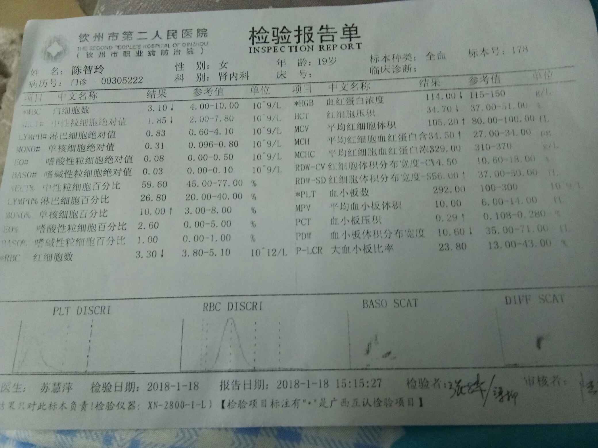 今天去复查了,有点担心,因为开始工作了,挺累的,怕检查不好。结果白细胞和红细胞数都低了!有点小担忧,会不会是工作才这样的。唉!!
