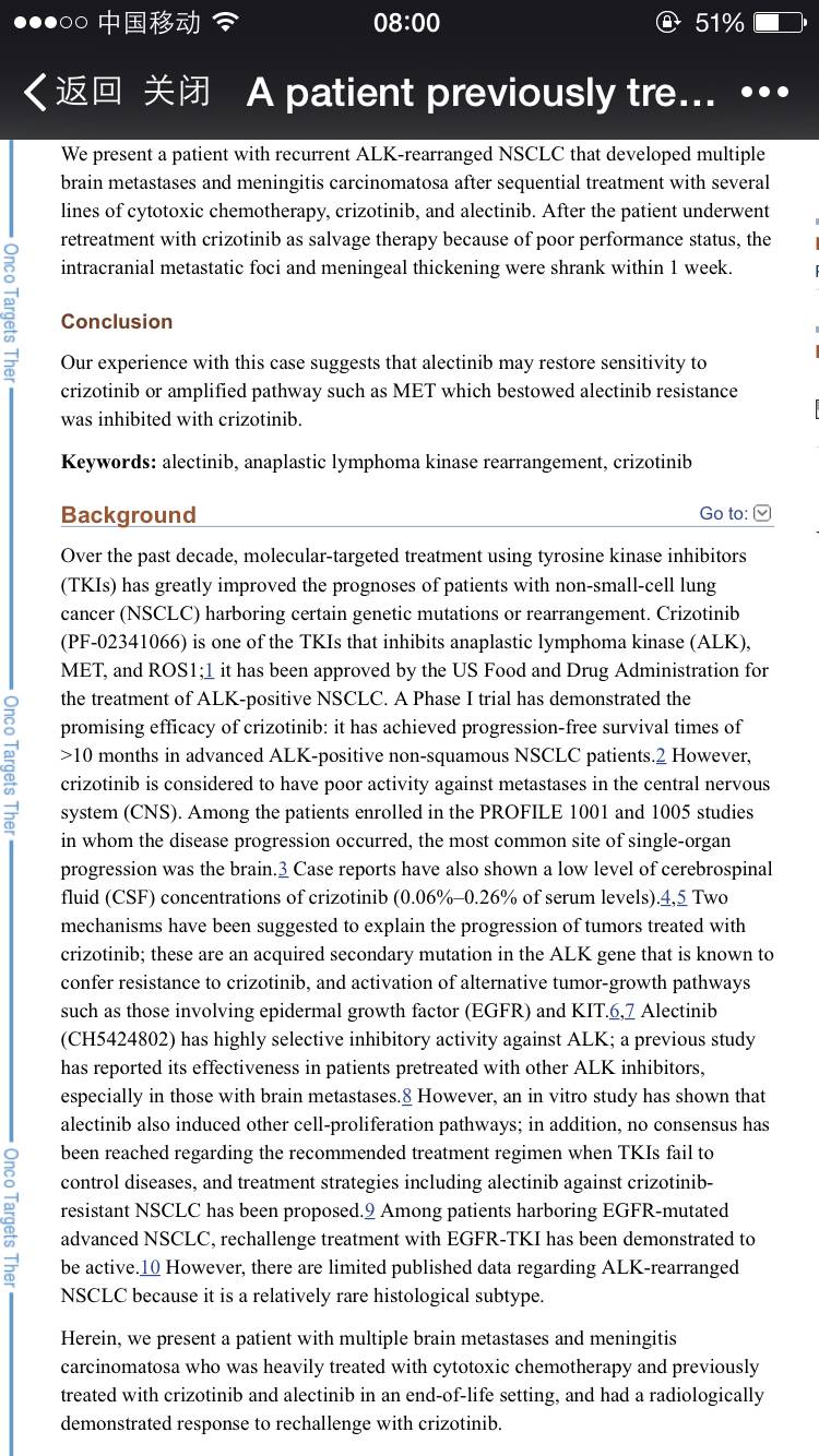 陈波医生这个案例是这样的,患者用克唑耐药了,第一次耐药机制是ALK本身的,换艾乐,起效了,然后艾乐再次耐药了,这次耐药机制是MET.艾乐自己对MET没办法啊,怎么办,结果试着换回克唑,竟然又起效了