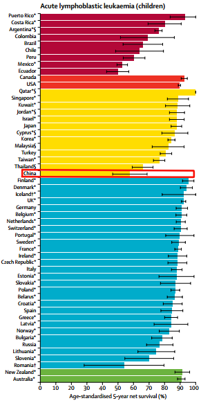 而我国在这三个统计到的儿童癌症上的表现也不尽如人意,分别为急性淋巴细胞白血病(57.7%)、淋巴瘤(61.1%)、脑瘤(41.1%)。