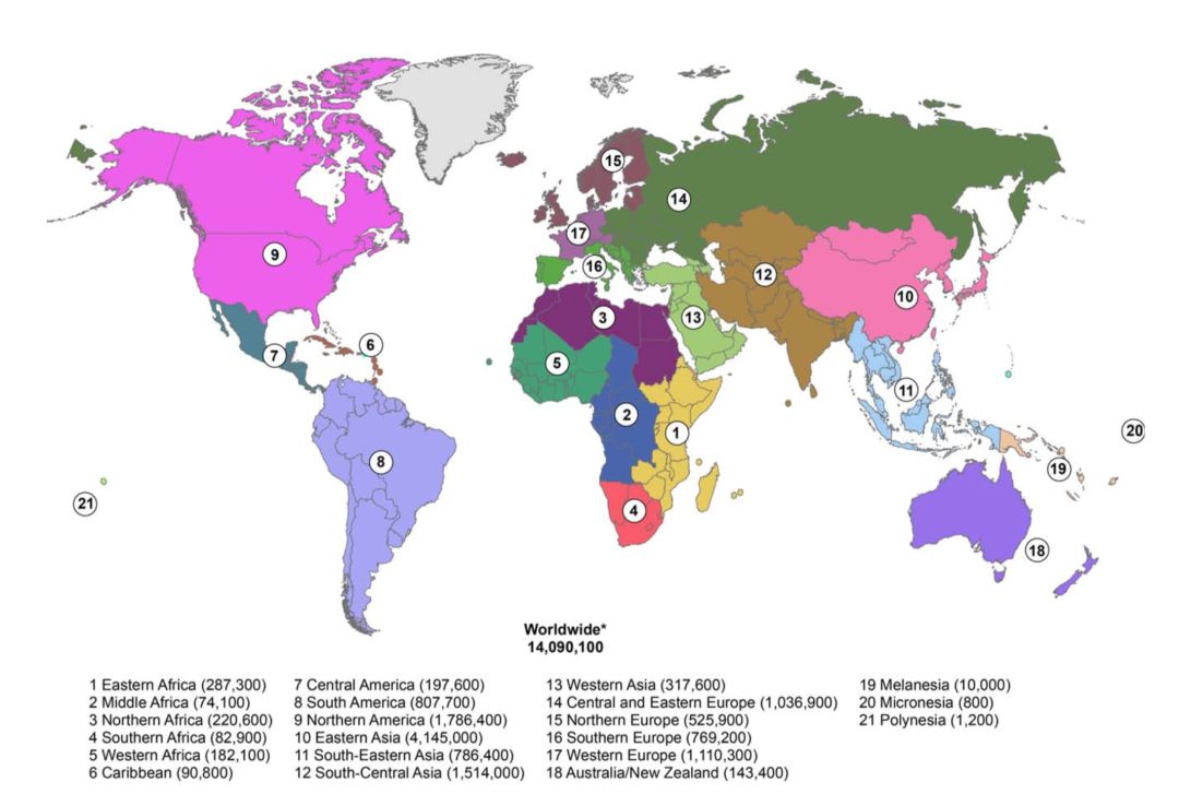图5 全球21个地区2012年新发癌症数量