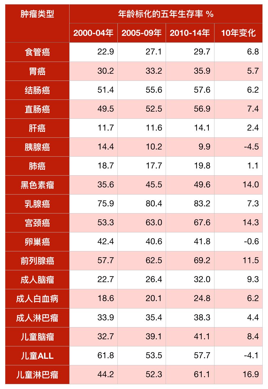 另有八种癌症五年生存率提高了5%~10%不等;