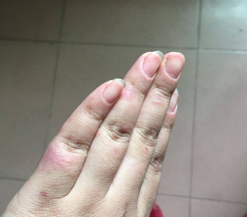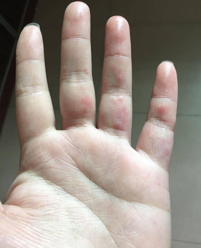 冻疮,过两天就会有点疼,然后会出现小坑,我就是这样,现在红外线烤手加上玉泽用好了