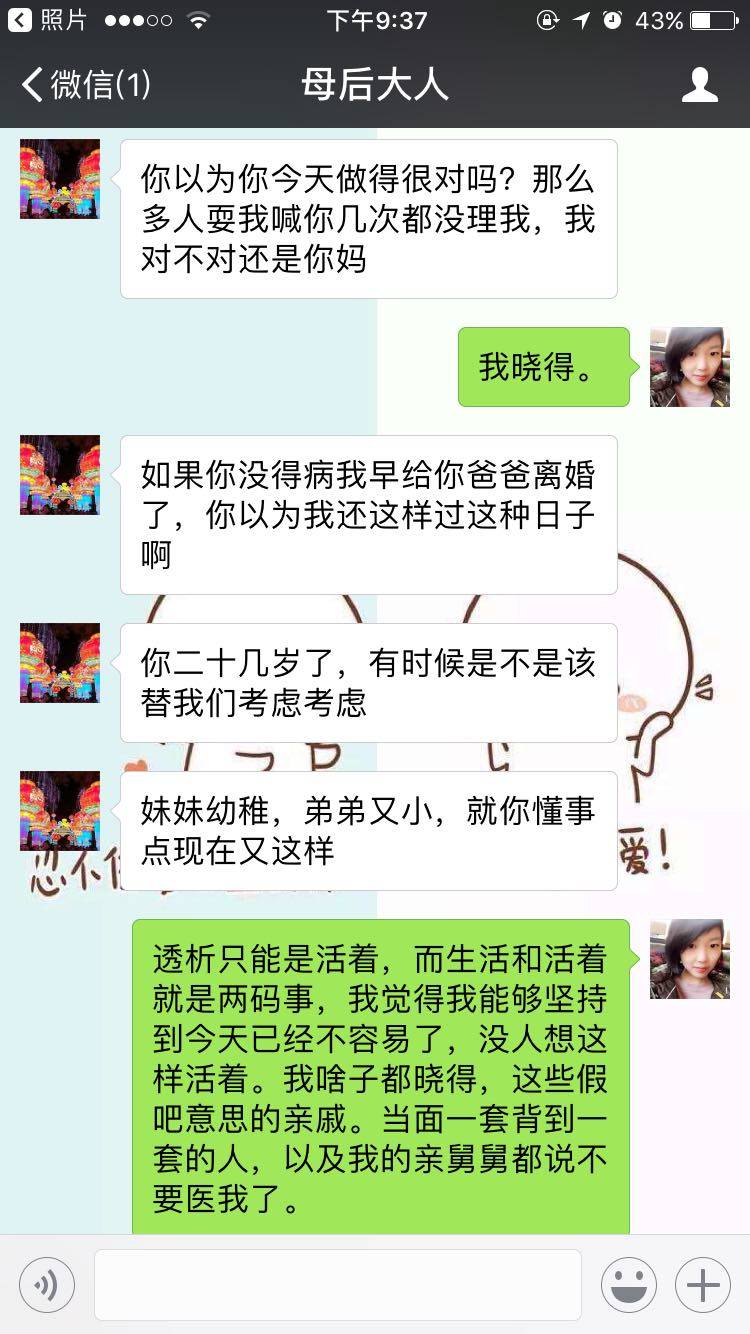 感觉你妈妈真的很不容易,你不要怄气了,虽然生病了到现在真的很不容易。我们也都倒霉,但是父母没有放弃我们就是给我们最好的爱。如果成功率低,花钱不说,你妈肯定也担心你在手术台上下不来,你可能觉得无所谓,都这样了拼一拼,死了就死了,但对于爱你的爸爸妈妈他们不会这么想,自己的孩子,舍不得。我那时候也是病危住了两个女的医院,一直靠输血输营养液维持着生命。口腔里长了个大东西堵住喉咙。连口水都吞不下去。再花了二十几万医疗费之后我选择放弃。我跟我妈说让她带我回家,那天我听到了她在卫生间撕心裂肺的哭。我妈胆子小,我做个骨穿她都腿软站不起来,我做血浆置换,她靠我婶婶扶着才做的稳,我血小板当时说就没有了,任何出血都有可能要了我的命,身为父母的他们怎么会不怕呢?站在你母亲的角度她真的没有错,她不只是你的母亲,你下面还有弟弟妹妹,我弟弟现在变得很不听话也没有责任感,