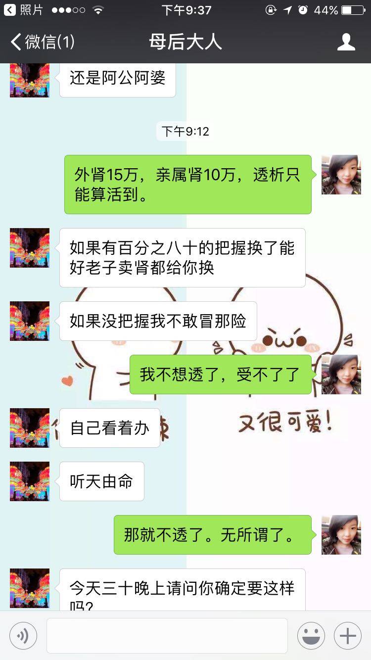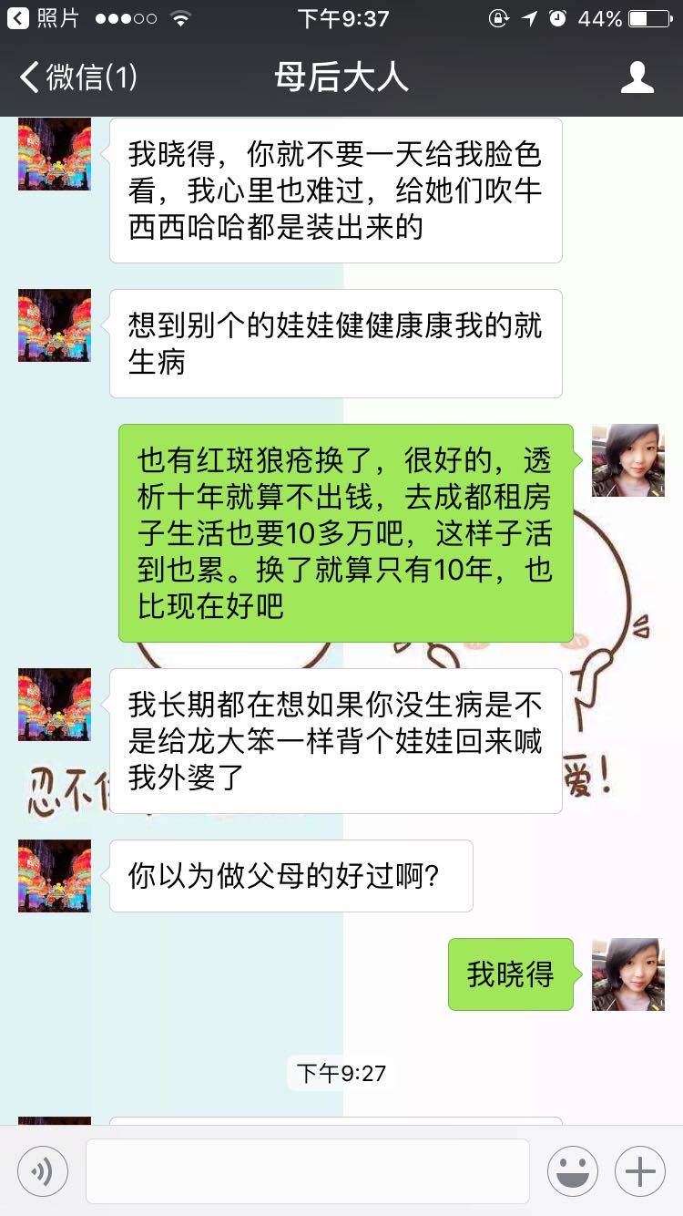 父母对孩子的爱是无私的,因人而异吧,我这里一个肌酐高的亲戚换了肾只活了五年,而且每天还吃药的,何况咋们还有狼疮你多咨询几个医生看看,任何手术都是有风险,父母的考虑也是有心的,或许有时候力不存心