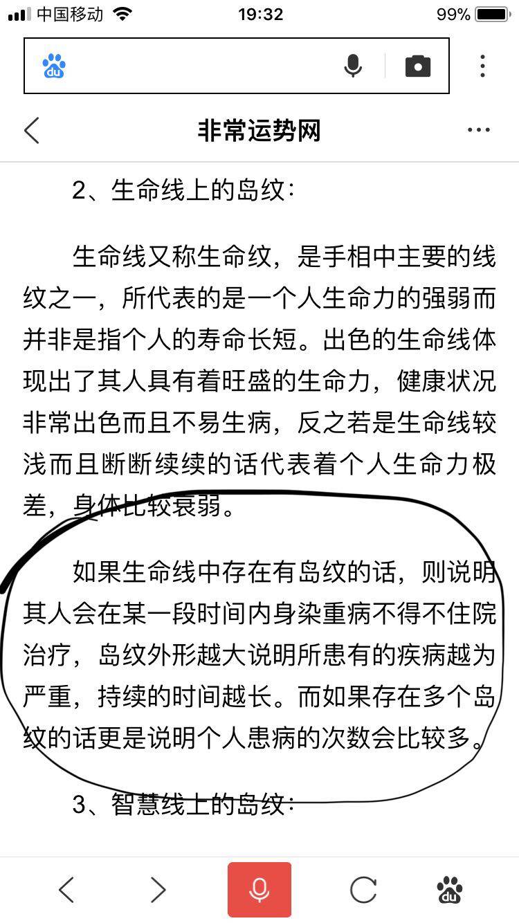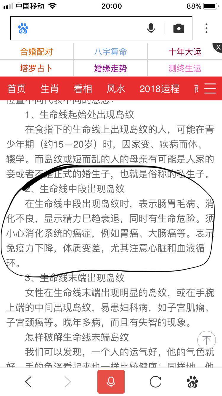 真的,我也有,以前给一个朋友看过说过无意说我生命线中间有一条纹,可能中间会发生什么事。