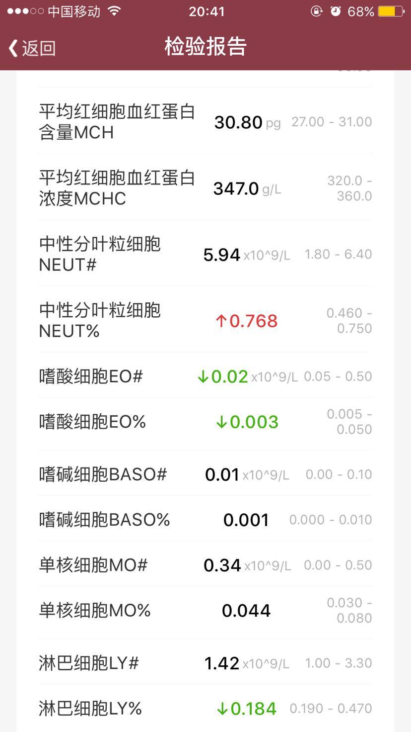 记得前年第一次复诊时我指着血细胞五分类的箭头问连㠶副主任医师是怎么一回事,她轻描淡写地解释说,那些不用管它,正常人也会有的!这个解释我一直半信半疑,直至到今天我手里拿着好几位非狼人的体检结果,才相信连主任说的话,正常人也会有这些升升降降的箭头的,大家可以淡定了。