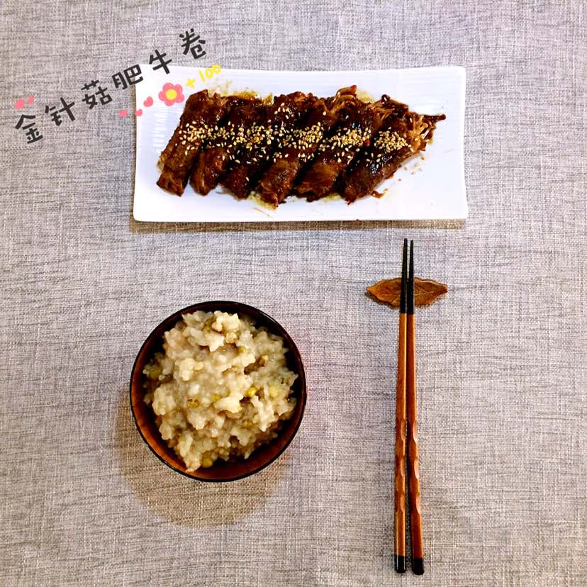 金针菇肥牛卷和绿豆燕麦粥,金针菇洗净去根,肥牛片是火锅肉片,把金针菇卷上,肉片有点薄,又卷了一片肉,都卷好放平锅里小火慢煎,这时候调酱汁,三勺酱油,两勺味霖,照烧汁一勺,红糖半勺,水六勺,盐半勺。肉卷两面煎变色后放酱汁,收汁盛盘,熟芝麻装饰,这个菜塞牙,吃的时候得备上牙签