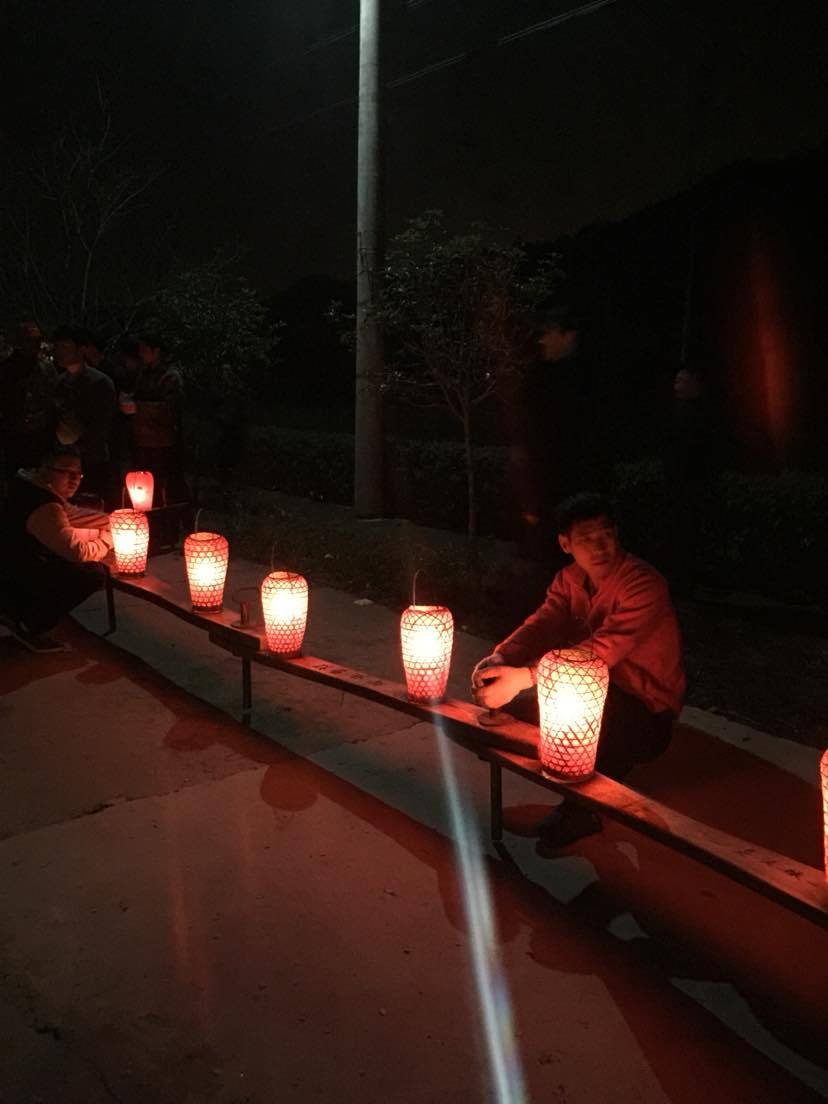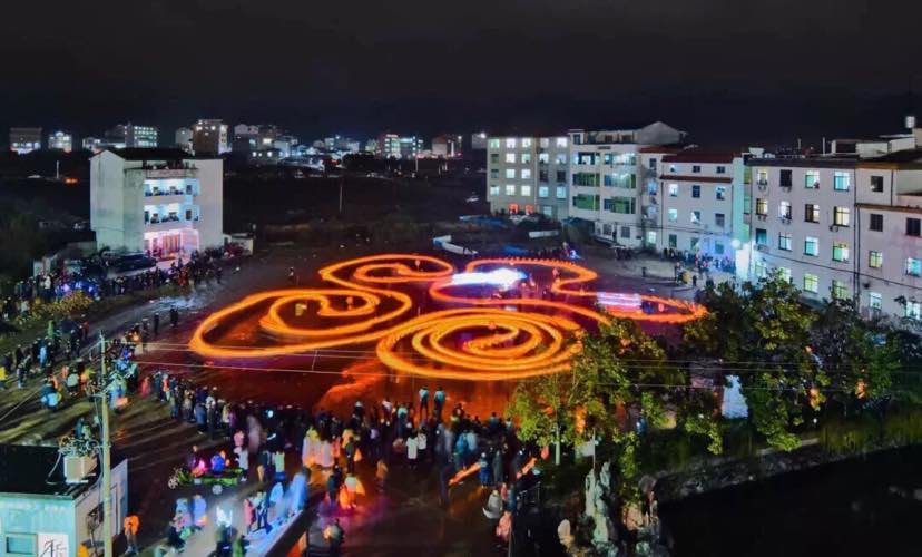 这是传说中的梅花灯,龙头位置前,有一个人一直举着火把引龙。
