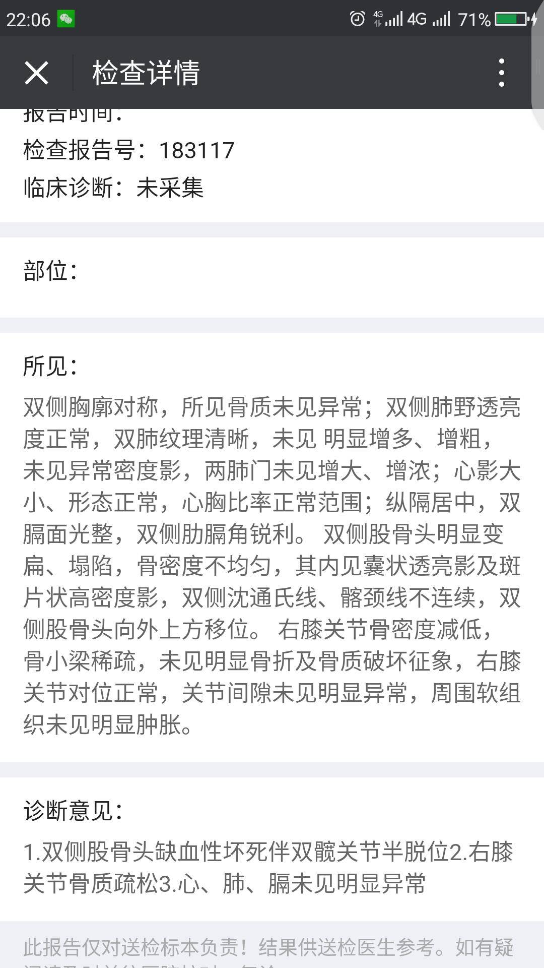 因为膝盖也疼,活动弯曲还咔咔响,所以也拍了片子,万幸不是膝盖坏死。至于股骨头,已经很严重了,因为拖的太久,加上还减压过,所以在这里我劝如果有股坏的病友,千万不要去做减压和植骨,因为压根没有用,本身我们就停不了激素,所以做也是枉然,不严重的可以多活动,骑自行车,无负重锻炼,泡脚,也可以吃些活血的中药,但是要去正规的医院开,至于严重的还是手术吧,因为除了手术真没办法了