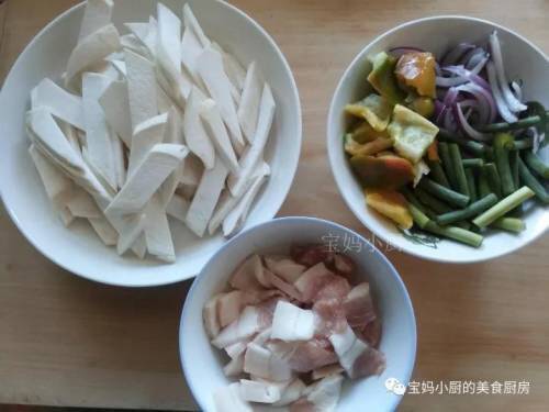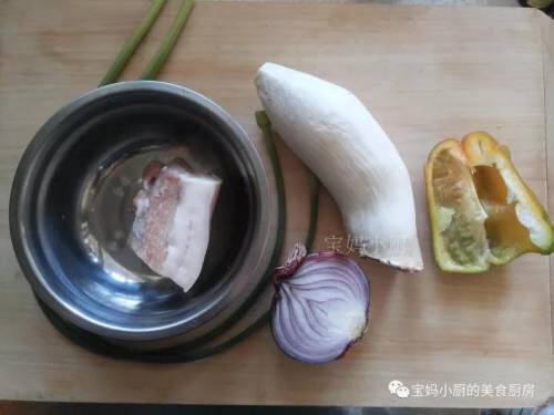 2.肉切肉片(不去皮),杏鲍菇切片,蒜苔切小段,青椒掰小块,洋葱切粗丝