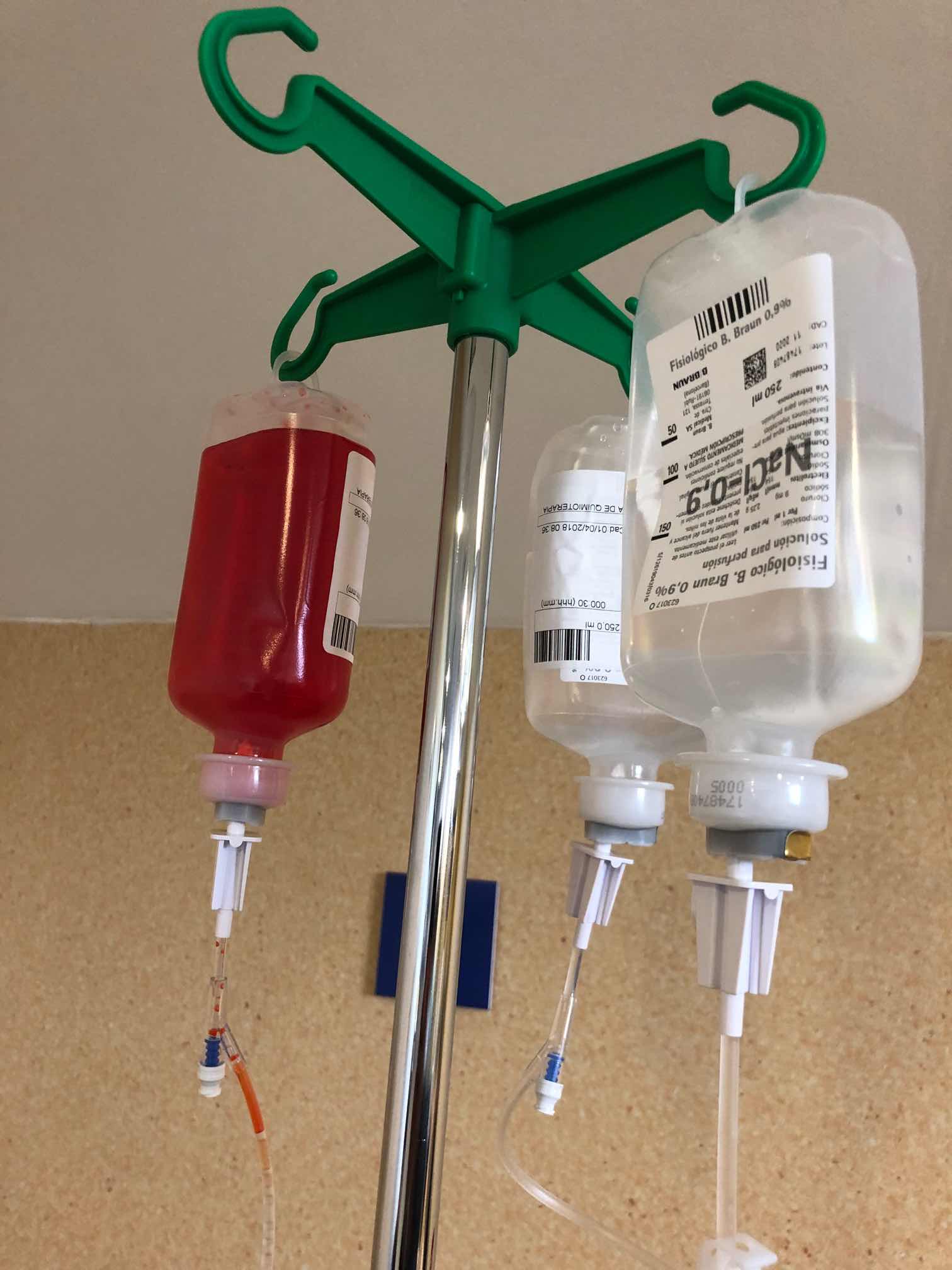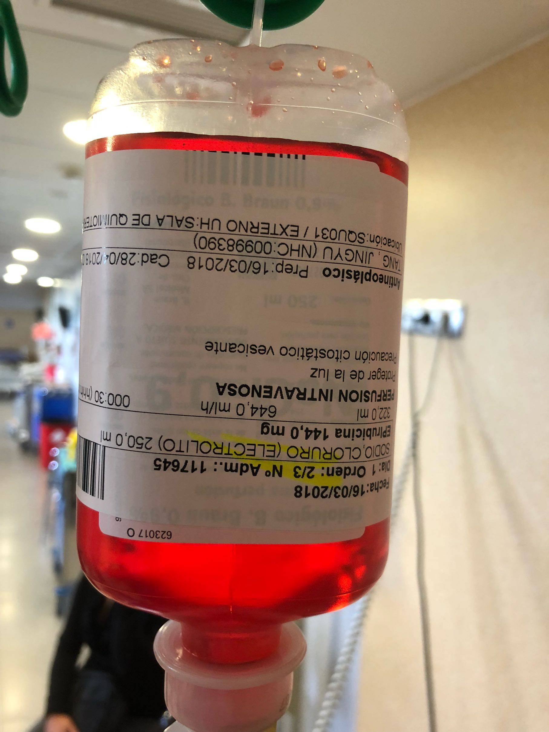 一共三瓶 总共两个半小时 白色的先输一半 休息5分钟 不可以去厕所 上红酒 输完红酒 休息5分钟 再输剩下的白色 可以去厕所了 整个过程由机器根据身高体重年龄完成输液速度设定 一上午就可以回家了