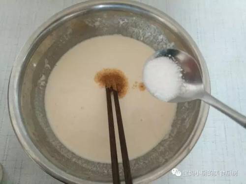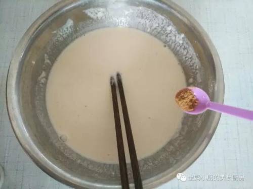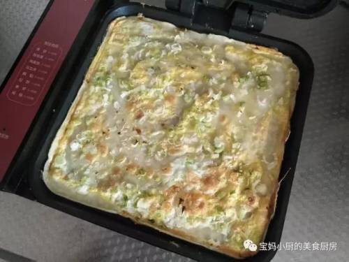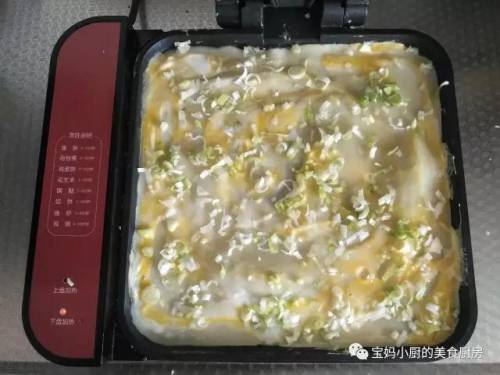 2)面糊凝固、加鸡蛋、撒葱花、盐,速度要快,,慢了葱花沾不上