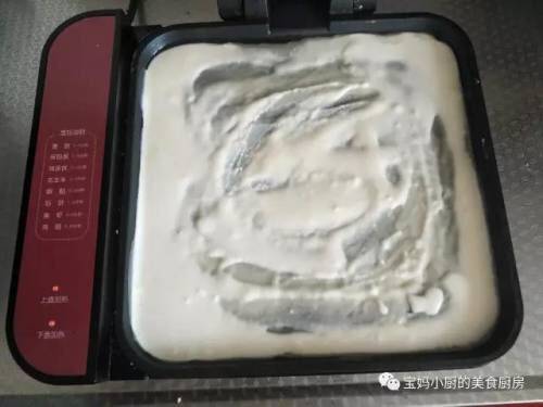 6.电饼铛预热,倒入两饭勺面糊摊平,合上饼铛盖10秒钟