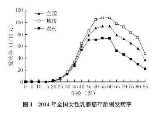 中国女性乳腺癌发病率在20岁之前处于较低的水平,此后发病率随年龄增长迅速上升,并于55岁年龄组达到高峰,而后随年龄增长下降。