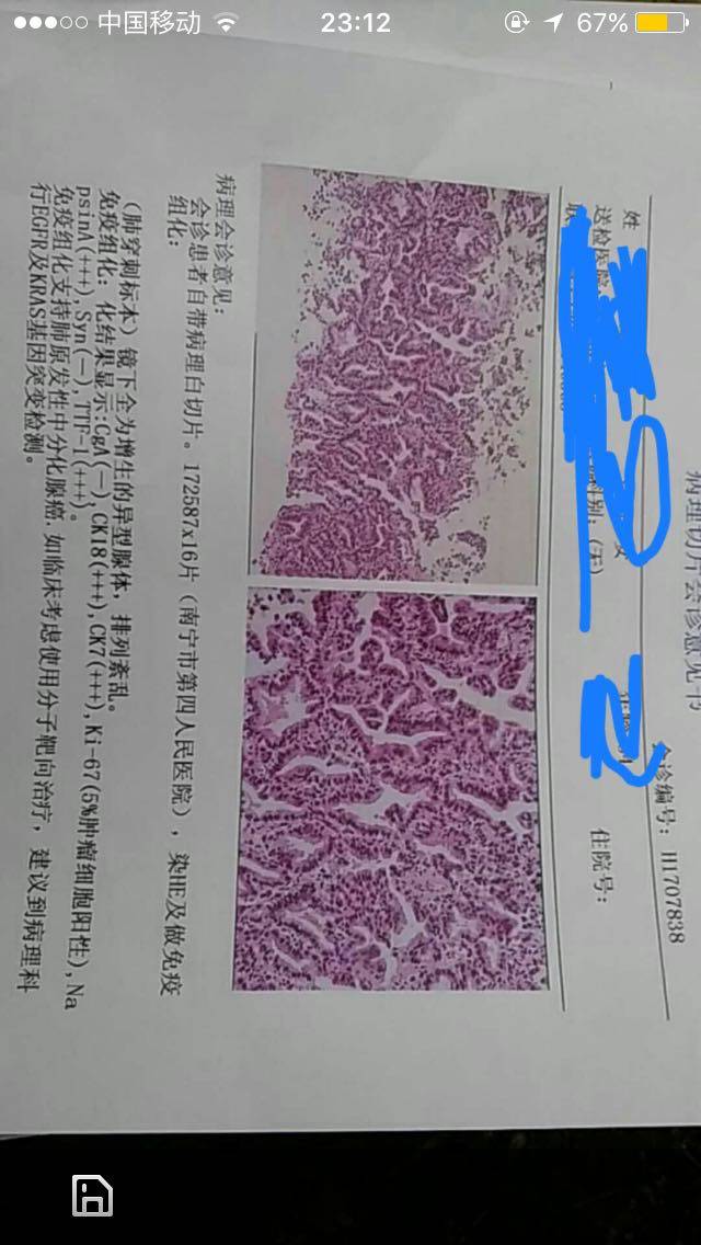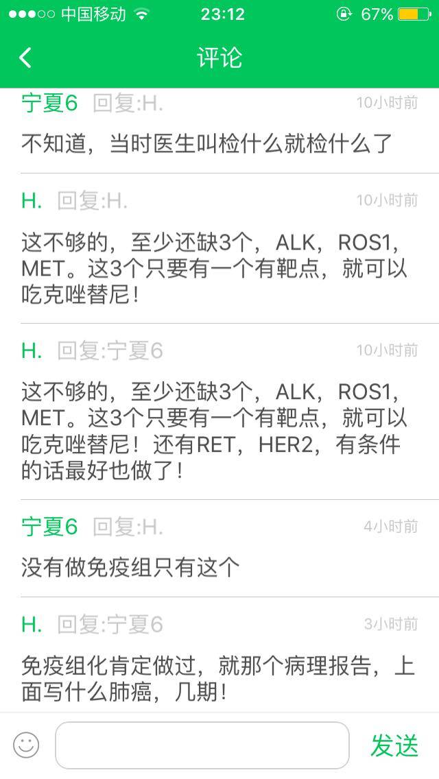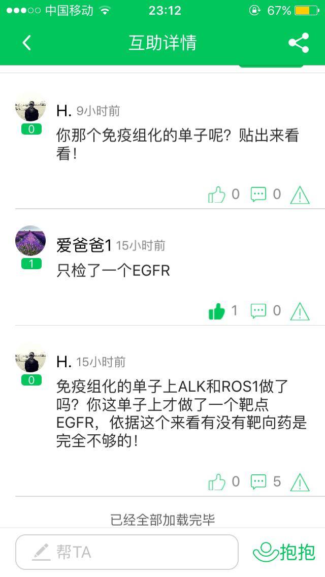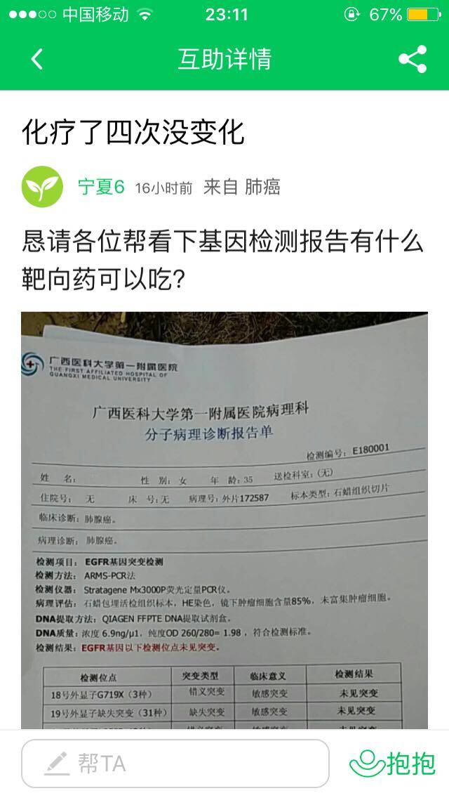 是这样的,今天早上,确切的说是昨天早上了,我看到这个互助,就回了,当时就觉得挺奇怪的,就做了一个靶点EGFR,没有检测到!当时我不太相信会有这种操作,我想会不会ALK和RSO1反映在免疫组化上了,那样的话也还说的过去!一天时间,和楼主断断续续的交流,我一直在等他,等的挺心焦的,期间我发现他不太懂,也说不明白,我就叫他把免疫组化的报告贴出来,等到刚才11点多,总算贴出来了,意味着我的心也彻底凉了!我不知道,一条35岁的人命在那些医院,医生眼里意味着什么,这算是在给患者省钱吗?患者不懂,你们也不懂吗?操他妈的就做一个靶点就完事了,就不能多说一句,多提醒一句啊?就直接上化疗了!我估计也没人跟他解读过基因检测报告,还有没有其他靶向药什么的,否则他也不会拿着只做了一个靶点的报告到这里来提问了!