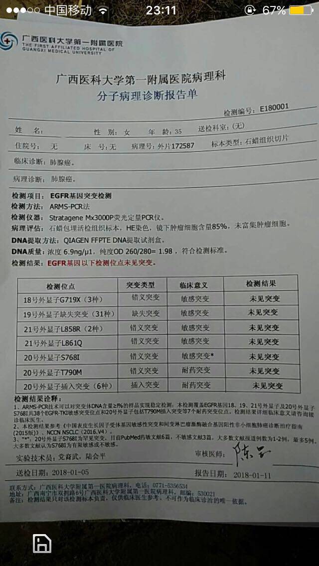 我们家当时大夫也只给做了EGFR,我们要求做全的,大夫说没必要。后来我们坚持做,才给推荐的外面的检测机构。直到最近看到小商商的检测报告才发现原来这个医院自己可以做ALK和ROS1。感觉被坑惨了