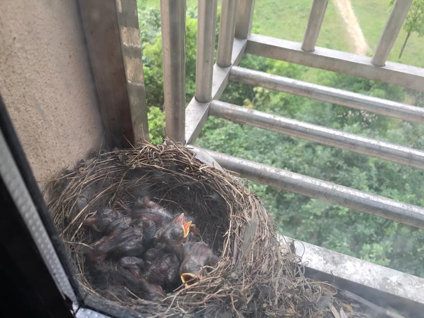 平时次卧没人住,上次一开窗吓一跳,发现有个鸟窝还有两枚鸟蛋。后面一天多一颗鸟蛋,六颗后就不再下蛋了。今天再一开窗,不得了,变一窝小鸟儿啦^_^虽然🐦宝宝有点丑丑的,可是很是开心啊,自从知道有鸟过来做窝,平时我都不敢开窗户的,怕把大鸟给吓跑....