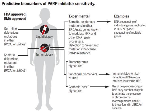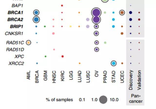 BRCA1和BRCA2被命名为乳腺癌1号/2号基因,是一种直接与遗传性乳腺癌有关的基因。同时,它们也是产生肿瘤抑制蛋白的人类基因,所编码的蛋白质有助于修复受损的DNA,在确保细胞遗传物质的稳定性方面起着重要作用。当这两个基因中的任何一种发生突变或改变时,其蛋白质产物要么没有被产生,要么没有正确地发挥作用,此时DNA损伤可能无法得到正确的修复。因此,细胞就有很大可能产生大量的基因变异,从而导致癌症。 *BRCA1和BRCA2的结构域 2 有哪些与BRCA基因突变有关的疾病? 由BRCA1和BRCA2突变引起的癌症风险是遗传的,尽管通常只有一个突变的等位基因是直接遗传的。这是因为有突变的人很可能会获得第二种突变,从而导致癌症的显性表达。 *BRCA基因突变是一种显性遗传(来源 Wikipedia) 根据美国ARUP实验室提供的在线数据库显示(详见下图),BRCA1与BRCA2突变的类型十分多样,包括缺失与插入、错义突变、无义突变以及剪接位点突变等,且没有所谓的“热点”突变区域,只有相对高频的突变位点。加之,这两个基因所包含的序列很长,都超过80kb,在这种“严峻”形式下,目前检测BRCA基因突变的平台,必然首推NGS(高通量测序)。 *BRCA1突变类型及变异分类 *BRCA2突变类型及变异分类 《Nature》子刊上的一项研究,揭示了BRCA1和BRCA2突变对除了乳腺癌之外的其他癌症的影响,发现了大量的BRCA1和BRCA2基因生殖系“截断”突变发生于乳腺癌以外的肿瘤,包括胃癌和前列腺癌。 *罕见“截断”突变中BRCA1/2被重点标注 3 BRCA1和BRCA2基因作为biomarker 有怎样的临床用药指导意义? 虽然BRCA胚系突变对于预测癌症风险是未来检测行业的必然趋势,但学界对遗传性疾病风险分析能力还在持续发展中,而且大多数临床医生对肿瘤风险筛查还是抱持着观望姿态。好消息是,最近《JAMA》杂志的一篇涉及1万例BRCA基因突变携带者的患癌风险预估试验,证实了BRCA胚系突变对于乳腺癌风险预测的有效性,这也给科学家研发出精准的癌症风险预测模型奠定数据基础。 *突变携带者的乳腺癌和卵巢癌的累积风险估计 而在肿瘤用药指导方面,以BRCA1/2作为biomarker已获批准。自2014年,FDA陆续批准了阿斯利康研发的奥拉帕尼与克洛维斯肿瘤公司推出的Rucaparib治疗BRCA基因突变的晚期卵巢癌,而在今年,更是重磅批准了Tesaro公司针对的BRCA1/2基因突变的癌症,比如卵巢癌和乳腺癌的新药——Niraparib。 *来源 FDA官网 这三种药物其实归根结底都是PARP抑制剂,是一种靶向聚ADP核糖聚合酶 (Poly ADP-ribose Polymerase) 的癌症疗法,是第一种以“合成致死”为设计理念获得临床批准的抗癌药物。携带BRCA1和BRCA2胚系突变的癌症患者对PARP抑制剂更为敏感,因为体内的肿瘤携带着特定的DNA修复缺陷,于是对能够抑制肿瘤细胞DNA损伤修复的PARP抑制剂敏感。 *BRCA1/2作为 PARP 抑制剂敏感性预测生物标志物 4 BRCA1和BRCA2基因突变指导晚期癌症靶向用药——衡道方案 上海衡道医学病理诊断中心重点围绕目前上市的首个口服类PARP抑制剂——奥拉帕尼开展基因突变筛查,基于高通量测序平台,只需5mL外周血即可对BRCA1与BRCA2进行全外显子组基因突变检测,提供患者个性化的晚期卵巢癌靶向治疗方案。