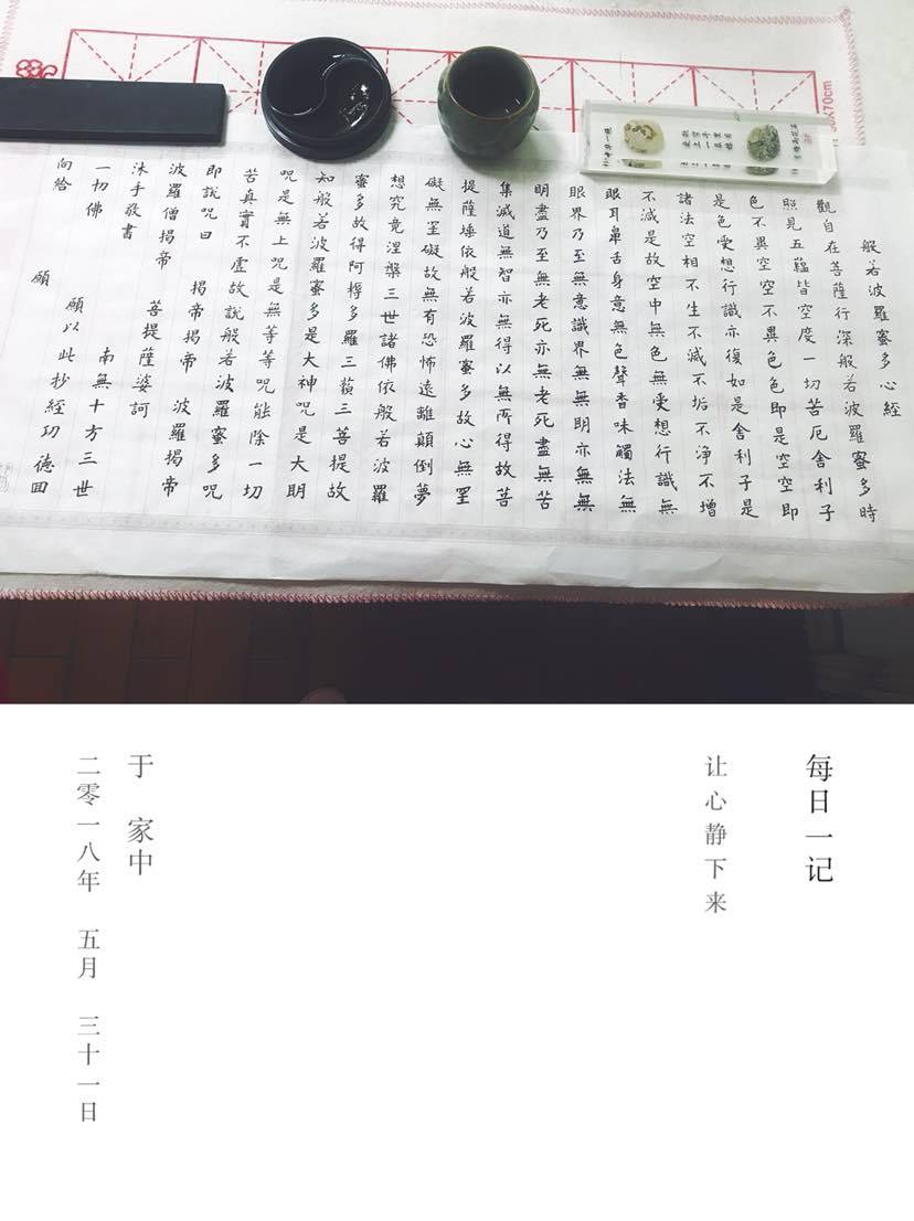 今晚一个人在家,打开音乐,点一支檀香,练习小楷抄写心经,心平气和地让时间缓缓流淌,脑袋也轻灵起来。在大事难事面前,一定要沉下心稳住气,着急上火、怨天尤人、哭成狗并不能解决问题,反而会形成一种紧张的氛围,使自己变得愈加着急,容易钻牛角尖,形成一个恶性循环。一定要让头脑保持清醒,不急不躁,才有可能做出正确的决断,进而度过难关。