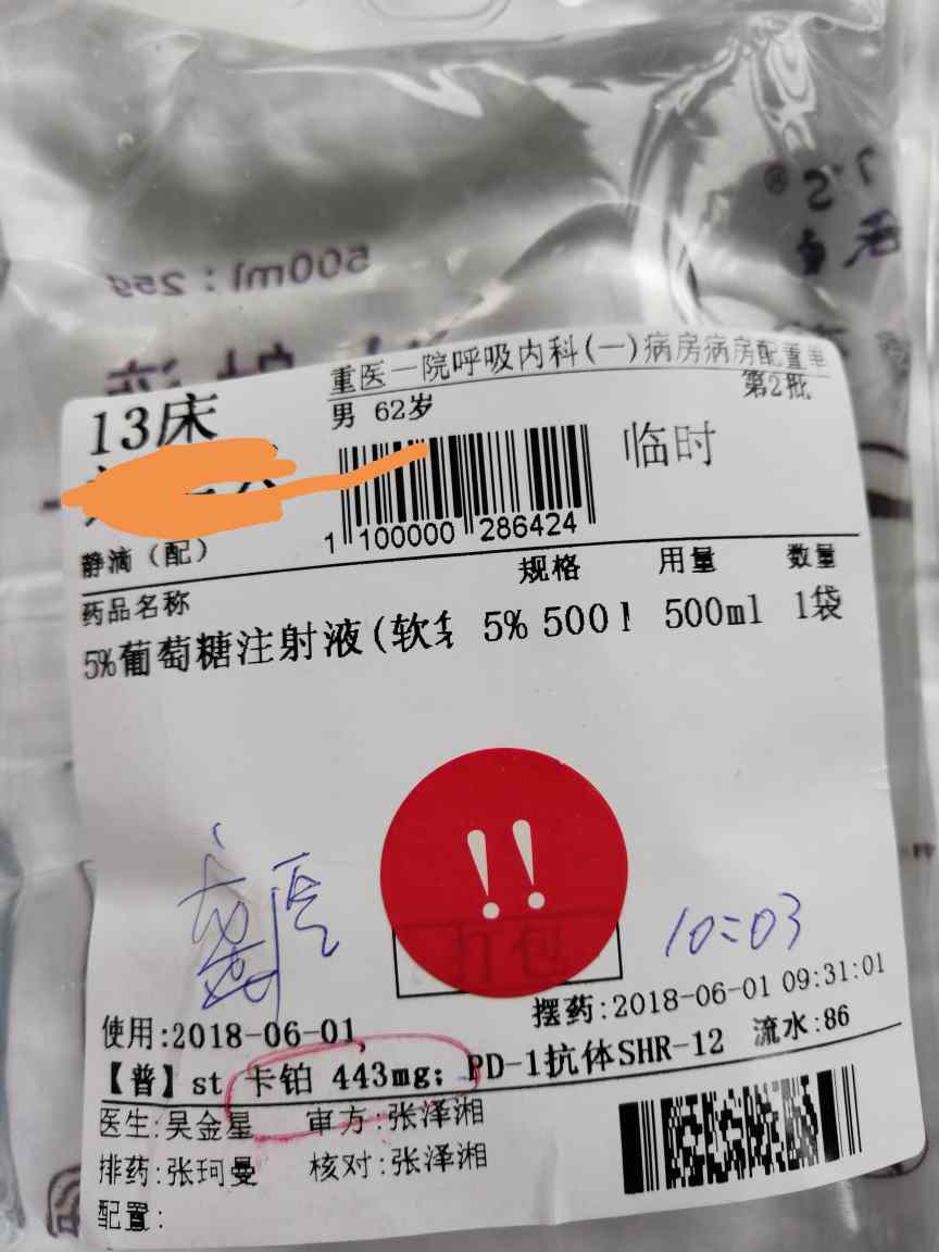 5月30日下午,医生找好房间通知住院准备进行五化,入院前进行四化后的CT复查,结果比二化约为缩小,骨转移无明显变化。四化完后副作用,由于提前吃了止吐药(盐酸昂丹司琼片),四化后呕心但没有吐,便秘,出吃水果蔬菜外,用开塞露,5天后可以解大便,嗜睡,白细胞低至1.38、红细胞低至2.42、血小板低至52,陆续打升白针,生红针各5针至今天勉强过关,背疼、胸疼无明显缓解,每天16小时左右吃奥施康定、洛芬待因缓释片各一片。我这次化疗方案看医生的情况是要做完6次培美曲塞加卡铂,6次完后根据情况才能有下一步的方案,因为是入组自己没有一点自主权,除非出组。明天就要五化了,的确,可能因身体原因,一次一次比一次的化疗,副作用一次比一次大,身体一次比一次差,最明显是心脏也明显过缓(以前没有),但因为是好不容易入组(目前是对照组用的是化疗),但还寄托能用上PTl,当然希望很小。我马上第五次化疗了,至今没有遇见和我一样入组化疗的,好想能有一样的情况可以相互交流相互支持,相互帮助的觅友,当然也希望得到觅友们的好的意见和建议,避免出现错误。希望我的贴能对觅友有益,同时再抗癌路上能提高自己的知识和能力。
