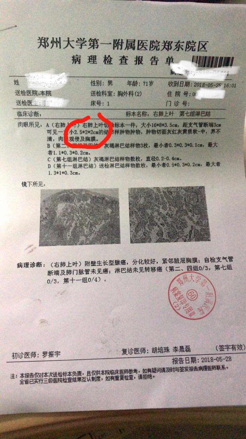 没有写有没有别的亚型成分,也没写分期。术后病灶和术前CT的截面大小差别比较大。分期是该看CT还是病理啊?